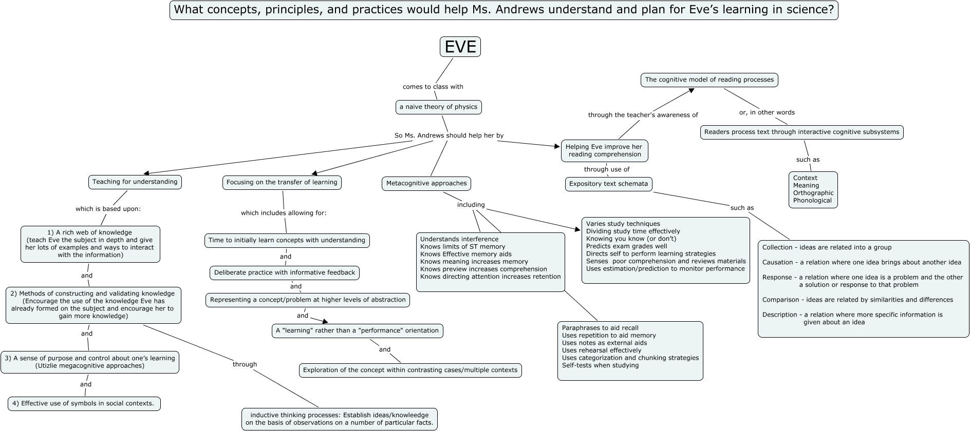 This Concept Map, created with IHMC CmapTools, has information related to: Nelson_Eve_Module 2.1, Focusing on the transfer of learning which includes allowing for: Time to initially learn concepts with understanding, Metacognitive approaches including Understands interference Knows limits of ST memory Knows Effective memory aids Knows meaning increases memory Knows preview increases comprehension Knows directing attention increases retention, a naive theory of physics So Ms. Andrews should help her by Helping Eve improve her reading comprehension, a naive theory of physics So Ms. Andrews should help her by Metacognitive approaches, A "learning" rather than a "performance" orientation and Exploration of the concept within contrasting cases/multiple contexts, Expository text schemata such as Collection - ideas are related into a group Causation - a relation where one idea brings about another idea Response - a relation where one idea is a problem and the other a solution or response to that problem Comparison - ideas are related by similarities and differences Description - a relation where more specific information is given about an idea, 1) A rich web of knowledge (teach Eve the subject in depth and give her lots of examples and ways to interact with the information) and 2) Methods of constructing and validating knowledge (Encourage the use of the knowledge Eve has already formed on the subject and encourage her to gain more knowledge), 2) Methods of constructing and validating knowledge (Encourage the use of the knowledge Eve has already formed on the subject and encourage her to gain more knowledge) and 3) A sense of purpose and control about one’s learning (Utizlie megacognitive approaches), Helping Eve improve her reading comprehension through the teacher's awareness of The cognitive model of reading processes, Deliberate practice with informative feedback and Representing a concept/problem at higher levels of abstraction, Time to initially learn concepts with understanding and Deliberate practice with informative feedback, 2) Methods of constructing and validating knowledge (Encourage the use of the knowledge Eve has already formed on the subject and encourage her to gain more knowledge) through inductive thinking processes: Establish ideas/knowleedge on the basis of observations on a number of particular facts., Helping Eve improve her reading comprehension through use of Expository text schemata, Teaching for understanding which is based upon: 1) A rich web of knowledge (teach Eve the subject in depth and give her lots of examples and ways to interact with the information), Readers process text through interactive cognitive subsystems such as Context Meaning Orthographic Phonological, Representing a concept/problem at higher levels of abstraction and A "learning" rather than a "performance" orientation, The cognitive model of reading processes or, in other words Readers process text through interactive cognitive subsystems, a naive theory of physics So Ms. Andrews should help her by Teaching for understanding, a naive theory of physics So Ms. Andrews should help her by Focusing on the transfer of learning, 3) A sense of purpose and control about one’s learning (Utizlie megacognitive approaches) and 4) Effective use of symbols in social contexts.