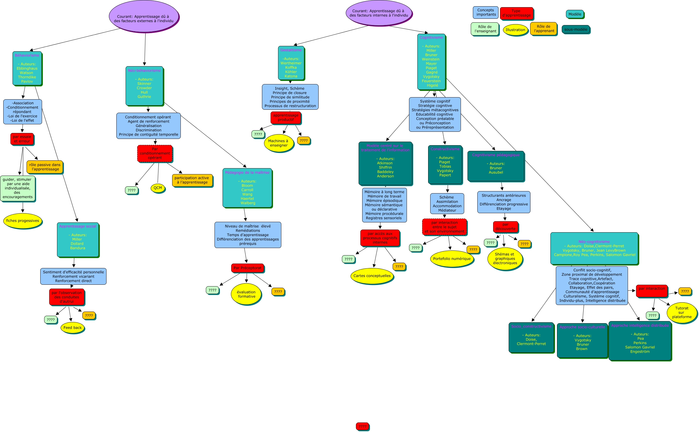Cette carte conceptuelle, cree avec IHMC CmapTools, contient des informations liees a : CC_equipe_final2_ver_berrada, par l'observation des conduites d'autrui ???? ????, par accès aux processus cognitifs internes ???? ????, apprentissage productif ???? ????, Cognitivisme pédagogique - Auteurs: Bruner Ausubel ???? Structurants antérieures Ancrage Différenciation progressive Etayage, apprentissage productif ???? Machines à enseigner, par découverte ???? Shémas et graphiques électroniques, apprentissage productif ???? ????, par interaction ???? ????, par interaction entre le sujet et son environnement ???? ????, -Association -Conditionnement répondant -Loi de l'exercice -Loi de l'effet ???? par essaie et erreur, par essaie et erreur ???? guider, stimuler par une aide individualisée, des encouragements, Cognitivisme - Auteurs: Miller Bruner Weinstein Mayer Piaget Gagné Vygotsky Feuerstein Higelé ???? Constructivisme - Auteurs: Piaget Tobias Vygotsky Papert, par accès aux processus cognitifs internes ???? ????, Par Préceptorat ???? évaluation formative, Modèle centré sur le traitement de l'information - Auteurs: Atkinson Shiffrin Baddeley Anderson ???? Mémoire à long terme Mémoire de travail Mémoire épisodique Mémoire sémantique ou déclarative Mémoire procédurale Registres sensoriels, Sentiment d'efficacité personnelle Renforcement vicariant Renforcement direct ???? par l'observation des conduites d'autrui, Gestaltisme -Auteurs: Wertheimer Koffka Köhler Katona ???? Insight, Schème Principe de closure Principe de similitude Principes de proximité Processus de restructuration, Insight, Schème Principe de closure Principe de similitude Principes de proximité Processus de restructuration ???? apprentissage productif, Conflit socio-cognitif, Zone proximal de développement Trace cognitive,Artefact, Collaboration,Coopération Etayage, Effet des pairs, Communauté d’apprentissage Culturalisme, Système cognitif, Individu-plus, Intelligence distribuée ???? par interaction, Courant: Apprentissage dû à des facteurs externes à l'individu ???? Néo-béhaviorisme - Auteurs: Skinner Crowder Hull Guthrie