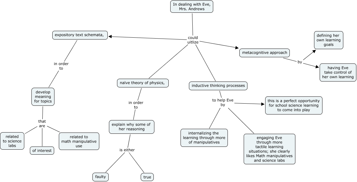 This Concept Map, created with IHMC CmapTools, has information related to: Alba_Anderson and Eve_1, inductive thinking processes to help Eve by engaging Eve through more tactile learning situations; she clearly likes Math manipulatives and science labs, In dealing with Eve, Mrs. Andrews could uitlize inductive thinking processes, naïve theory of physics, in order to explain why some of her reasoning, In dealing with Eve, Mrs. Andrews could uitlize expository text schemata,, metacognitive approach by having Eve take control of her own learning, explain why some of her reasoning is either true, inductive thinking processes to help Eve by this is a perfect opportunity for school science learning to come into play, develop meaning for topics that are of interest, develop meaning for topics that are related to math manipulative use, explain why some of her reasoning is either faulty, inductive thinking processes to help Eve by internalizing the learning through more of manipulatives, expository text schemata, in order to develop meaning for topics, develop meaning for topics that are related to science labs, In dealing with Eve, Mrs. Andrews could uitlize naïve theory of physics,, metacognitive approach by defining her own learning goals, In dealing with Eve, Mrs. Andrews could uitlize metacognitive approach