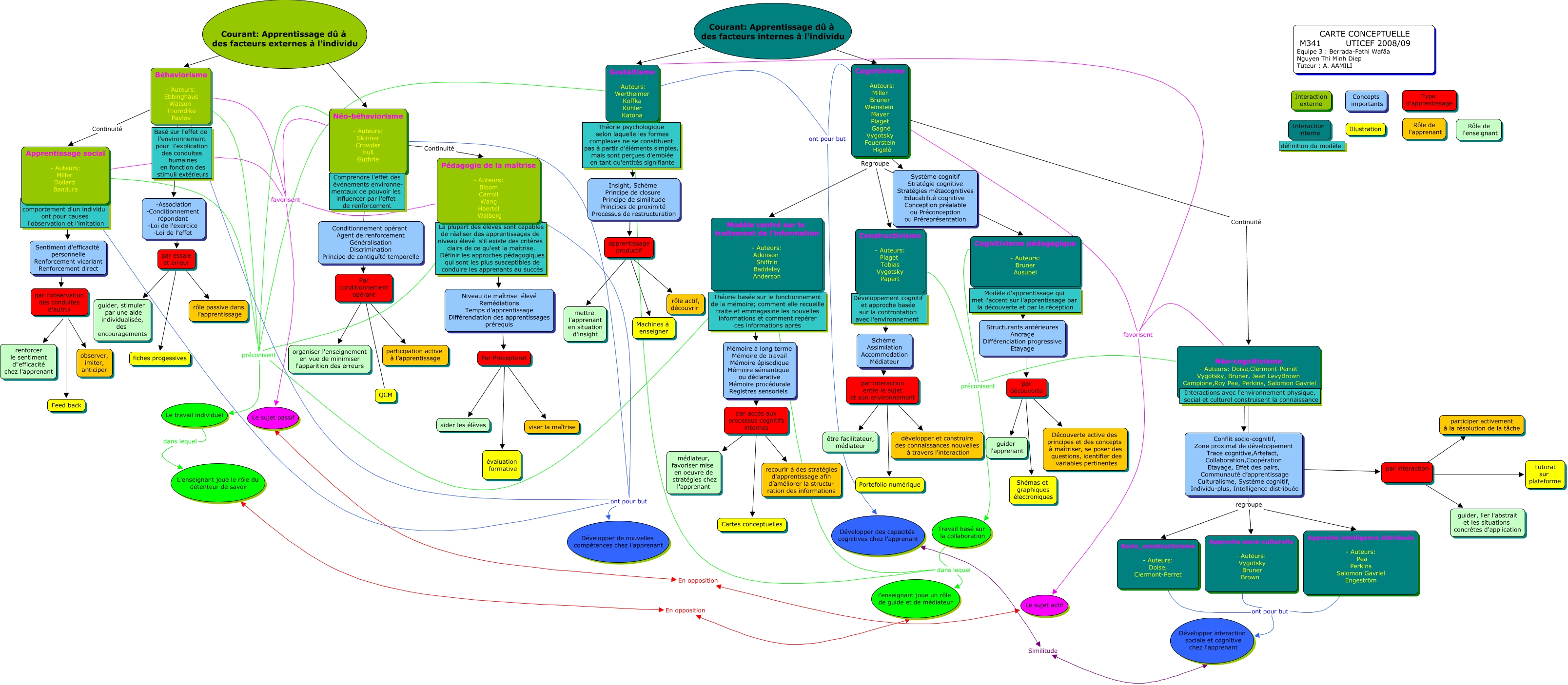 Cette carte de concepts créée avec IHMC CmapTools traite de: cc équipe_ver_berrada, par essaie et erreur ???? guider, stimuler par une aide individualisée, des encouragements, -Association -Conditionnement répondant -Loi de l'exercice -Loi de l'effet ???? par essaie et erreur, Néo-béhaviorisme - Auteurs: Skinner Crowder Hull Guthrie préconisent Le travail individuel, apprentissage productif ???? Machines à enseigner, Insight, Schème Principe de closure Principe de similitude Principes de proximité Processus de restructuration ???? apprentissage productif, Cognitivisme - Auteurs: Miller Bruner Weinstein Mayer Piaget Gagné Vygotsky Feuerstein Higelé favorisent Gestaltisme -Auteurs: Wertheimer Koffka Köhler Katona, par accès aux processus cognitifs internes ???? médiateur, favoriser mise en oeuvre de stratégies chez l'apprenant, Apprentissage social - Auteurs: Miller Dollard Bandura ont pour but Développer de nouvelles compétences chez l'apprenant, Néo-cognitivisme - Auteurs: Doise,Clermont-Perret Vygotsky, Bruner, Jean LevyBrown Campione,Roy Pea, Perkins, Salomon Gavriel favorisent Gestaltisme -Auteurs: Wertheimer Koffka Köhler Katona, Par Préceptorat ???? aider les élèves, par accès aux processus cognitifs internes ???? recourir à des stratégies d'apprentissage afin d’améliorer la structu- ration des informations, par l'observation des conduites d'autrui ???? observer, imiter, anticiper, Béhaviorisme - Auteurs: Ebbinghaus Watson Thorndike Pavlov ???? -Association -Conditionnement répondant -Loi de l'exercice -Loi de l'effet, Approche socio-culturelle - Auteurs: Vygotsky Bruner Brown ont pour but Développer interaction sociale et cognitive chez l'apprenant, par interaction ???? Tutorat sur plateforme, Courant: Apprentissage dû à des facteurs externes à l'individu ???? Néo-béhaviorisme - Auteurs: Skinner Crowder Hull Guthrie, Béhaviorisme - Auteurs: Ebbinghaus Watson Thorndike Pavlov Continuité Apprentissage social - Auteurs: Miller Dollard Bandura, Mémoire à long terme Mémoire de travail Mémoire épisodique Mémoire sémantique ou déclarative Mémoire procédurale Registres sensoriels ???? par accès aux processus cognitifs internes, Constructivisme - Auteurs: Piaget Tobias Vygotsky Papert ???? Schème Assimilation Accommodation Médiateur, Par Préceptorat ???? viser la maîtrise