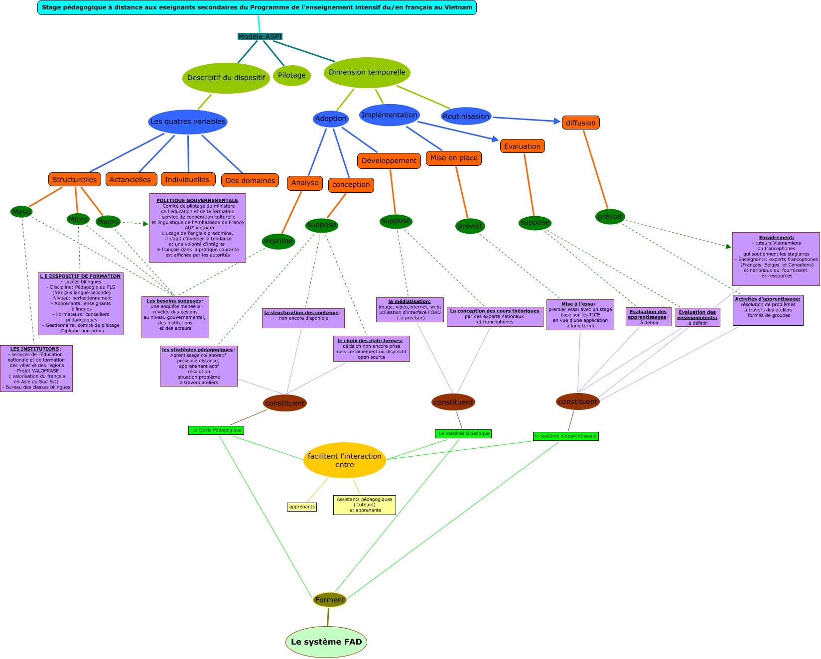Cette carte de concepts créée avec IHMC CmapTools traite de: CC collective finale equipe2, Dimension temporelle Adoption conception, Structurelles Macro POLITIQUE GOUVERNEMENTALE - Comité de pilotage du ministère de l'éducation et de la formation - service de coopération culturelle et linguistique de l'Ambassade de France - AUF Vietnam L'usage de l'anglais prédomine, il s'agit d'nverser la tendance et une volonté d'intégrer le français dans la pratique courante est affichée par les autorités, Dimension temporelle Adoption Développement, Stage pédagogique à distance aux eseignants secondaires du Programme de l’enseignement intensif du/en français au Vietnam Modèle ASPI Dimension temporelle, Evaluation des apprentissages: à définir constituent le système d'apprentissage, Descriptif du dispositif Les quatres variables Individuelles, Structurelles Macro Les besoins supposés: une enquête menée a révélée des besions au niveau gouvernemental, des institutions et des acteurs, le choix des plate formes: décision non encore prise mais certainement un dispositif open source constituent Le Devis Pédagogique, Evaluation suppose Evaluation des apprentissages: à définir, Le Devis Pédagogique facilitent l'interaction entre apprenants, Activités d'apprentissage: résolution de problèmes à travers des ateliers formés de groupes constituent le système d'apprentissage, Le matériel Didactique facilitent l'interaction entre Assistants pédagogiques ( tuteurs) et apprenants, diffusion prévoit Encadrement: - tuteurs Vietnamiens ou francophones qui soutiennent les stagiaires - Enseignants: experts francophones (Français, Belges, et Canadiens) et nationaux qui fournissent les ressources, Evaluation des enseignements: à définir constituent le système d'apprentissage, conception suppose le choix des plate formes: décision non encore prise mais certainement un dispositif open source, le système d'apprentissage Forment Le système FAD, Structurelles Micro L E DISPOSITIF DE FORMATION - Lycées bilingues - Discipline: Pédagogie du FLS (français langue seconde) - Niveau: perfectionnement - Apprenants: enseignants bilingues - Formateurs: conseillers pédagogiques - Gestionnaire: comité de pilotage - Diplôme non prévu, Structurelles Micro Les besoins supposés: une enquête menée a révélée des besions au niveau gouvernemental, des institutions et des acteurs, diffusion prévoit Activités d'apprentissage: résolution de problèmes à travers des ateliers formés de groupes, Analyse exprime Les besoins supposés: une enquête menée a révélée des besions au niveau gouvernemental, des institutions et des acteurs