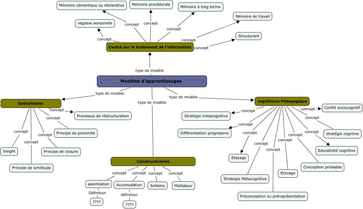 Cette carte conceptuelle, cree avec IHMC CmapTools, contient des informations liees a : Elias équipe1, Centré sur le traitement de l'information concept Mémoire à long terme, Gestalististe concept Principe de similitude, Constructivisme concept Médiateur, cognitisme Pédagogique concept Encrage, cognitisme Pédagogique concept Educabilité cognitive, cognitisme Pédagogique concept Préconception ou préreprésentation, Constructivisme concept assimilation, cognitisme Pédagogique concept Strategie Métacognitive, Gestalististe concept Insight, Constructivisme concept Accomodation, Centré sur le traitement de l'information concept Mémoire procédurale, Centré sur le traitement de l'information concept Mémoire cémantique ou déclarative, cognitisme Pédagogique concept Différentiation progressive, Modèles d'apprentissages type de modèle cognitisme Pédagogique, Modèles d'apprentissages type de modèle Constructivisme, cognitisme Pédagogique concept Etayage, Gestalististe concept Principe de closure, Centré sur le traitement de l'information concept Structurant, Constructivisme concept Schème, cognitisme Pédagogique concept Conflit sociocognitif
