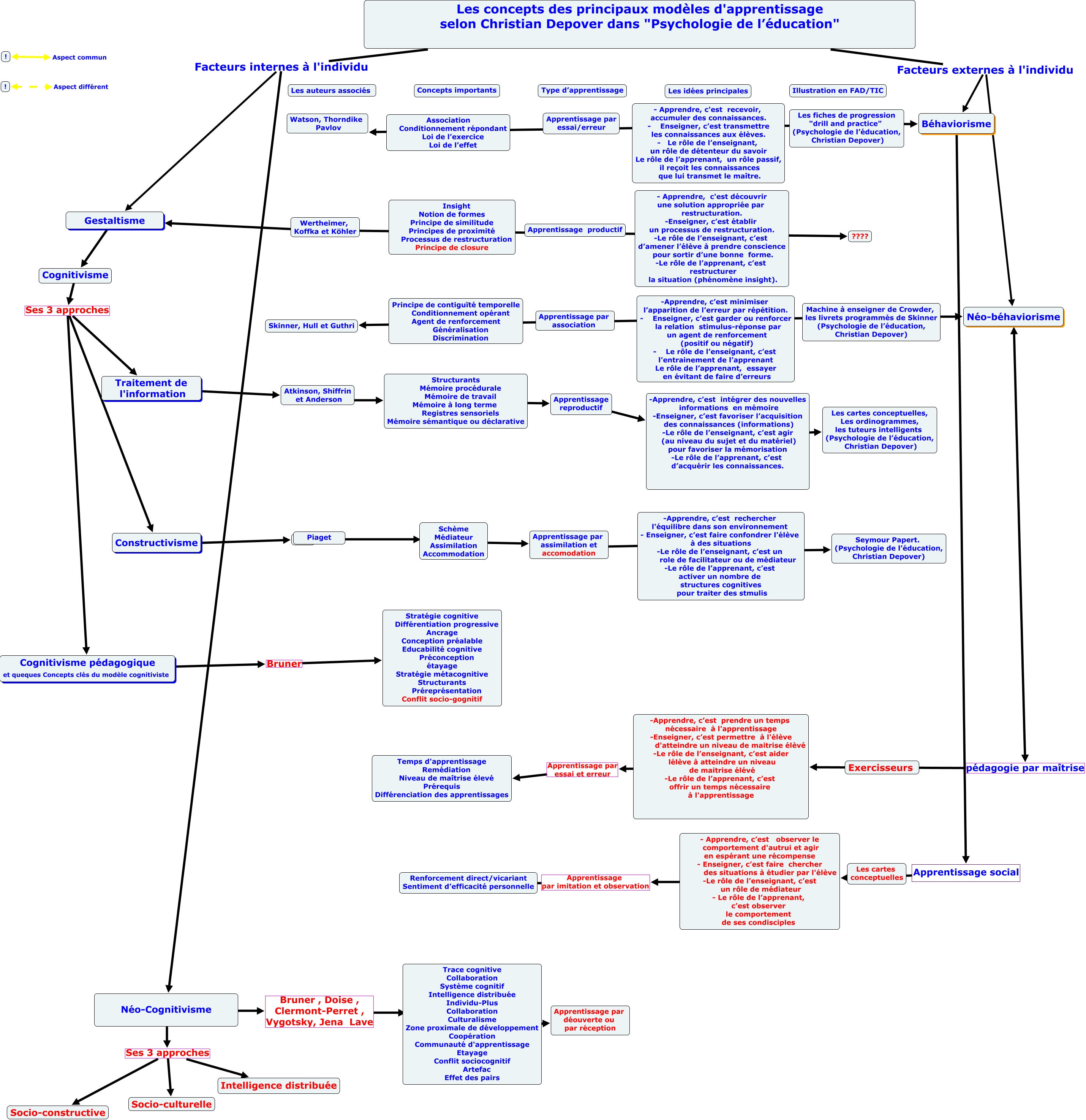 Cette carte conceptuelle, cree avec IHMC CmapTools, contient des informations liees a : CC collective finale equipe2, Traitement de l'information ???? Atkinson, Shiffrin et Anderson, Piaget ???? ????, Cognitivisme Ses 3 approches Constructivisme, Béhaviorisme ???? Watson, Thorndike Pavlov, Les concepts des principaux modèles d'apprentissage selon Christian Depover dans "Psychologie de l’éducation" Facteurs externes à l'individu Néo-béhaviorisme, Néo-béhaviorisme pédagogie par maîtrise - Apprendre, c’est prendre un temps nécessaire à l'apprentissage - Enseigner, c’est permettre à l'élève d'atteindre un niveau de maitrise élèvé - Le rôle de l’enseignant, c’est aider lélève à atteindre un niveau de maitrise élévé - Le rôle de l’apprenant, c’est offrir un temps nécessaire à l'apprentissage, Béhaviorisme Apprentissage social - Apprendre, c’est observer le comportement d'autrui et agir en espérant une récompense - Enseigner, c’est faire chercher des situations à étudier par l'élève - Le rôle de l’enseignant, c’est un rôle de médiateur - Le rôle de l’apprenant, c’est observer le comportement de ses condisciples, Atkinson, Shiffrin et Anderson ???? Structurants Mémoire procédurale Mémoire de travail Mémoire à long terme Registres sensoriels Mémoire sémantique ou déclarative, Néo-Cognitivisme Ses 3 approches Socio-culturelle, Néo-Cognitivisme Ses 3 approches Socio-constructive, Gestaltisme ???? Cognitivisme, - Apprendre, c’est rechercher l'équilibre dans son environnement - Enseigner, c’est faire confondrer l'élève à des situations - Le rôle de l’enseignant, c’est un role de facilitateur ou de médiateur - Le rôle de l’apprenant, c’est activer un nombre de structures cognitives pour traiter des stmulis ???? Seymour Papert. (Psychologie de l’éducation, Christian Depover), Néo-Cognitivisme Ses 3 approches Intelligence distribuée, - Apprendre, c’est prendre un temps nécessaire à l'apprentissage - Enseigner, c’est permettre à l'élève d'atteindre un niveau de maitrise élèvé - Le rôle de l’enseignant, c’est aider lélève à atteindre un niveau de maitrise élévé - Le rôle de l’apprenant, c’est offrir un temps nécessaire à l'apprentissage Apprentissage par essai et erreur Temps d'apprentissage Remédiation Niveau de maîtrise élevé Prérequis Différenciation des apprentissages, Apprentissage par assimilation et accomodation ???? ????, Les concepts des principaux modèles d'apprentissage selon Christian Depover dans "Psychologie de l’éducation" Facteurs internes à l'individu Gestaltisme, Cognitivisme Ses 3 approches Traitement de l'information, Les concepts des principaux modèles d'apprentissage selon Christian Depover dans "Psychologie de l’éducation" Facteurs internes à l'individu Néo-Cognitivisme, Gestaltisme ???? ????, - Apprendre, c’est observer le comportement d'autrui et agir en espérant une récompense - Enseigner, c’est faire chercher des situations à étudier par l'élève - Le rôle de l’enseignant, c’est un rôle de médiateur - Le rôle de l’apprenant, c’est observer le comportement de ses condisciples Apprentissage par imitation et observation Renforcement direct/vicariant Sentiment d’efficacité personnelle