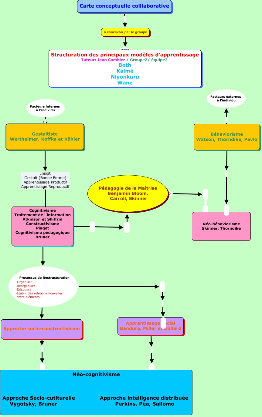 Cette carte conceptuelle, cree avec IHMC CmapTools, contient des informations liees a : carte-collective-équip2 à améliorer, Approche socio-constructivisme, Béhaviorisme Watson, Thorndike, Pavlo Facteurs externes à l'individu, Gestaltiste Wertheimer, Koffka et Köhler Facteurs internes à l'individu,, Cognitivisme Traitement de l'information Atkinson et Shiffrin Constructivisme Piaget Cognitivisme pédagogique Bruner ????, Apprentissage social Bandura, Miller et Dollard, Pédagogie de la Maîtrise Benjamin Bloom, Carroll, Skinner ????, Gestaltiste Wertheimer, Koffka et Köhler Insigt Gestalt (Bonne Forme) Apprentissage Productif Apprentissage Reproductif ????, Cognitivisme Traitement de l'information Atkinson et Shiffrin Constructivisme Piaget Cognitivisme pédagogique Bruner Processus de Restructuration -Organiser -Réorganiser -Découvrir -Etablir des relations nouvelles entre éléments Approche socio-constructivisme, Cognitivisme Traitement de l'information Atkinson et Shiffrin Constructivisme Piaget Cognitivisme pédagogique Bruner Processus de Restructuration -Organiser -Réorganiser -Découvrir -Etablir des relations nouvelles entre éléments, Béhaviorisme Watson, Thorndike, Pavlo,