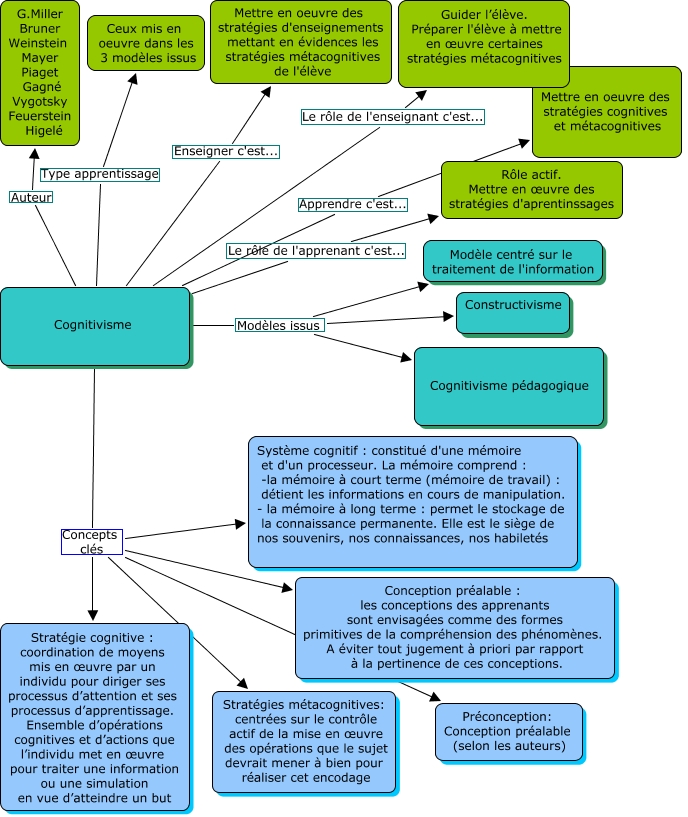 Cette carte conceptuelle, cree avec IHMC CmapTools, contient des informations liees a : carte_cognitivisme_berrada, Cognitivisme Le rôle de l'apprenant c'est... Rôle actif. Mettre en œuvre des stratégies d'aprentinssages, Cognitivisme Concepts clés Stratégies métacognitives: centrées sur le contrôle actif de la mise en œuvre des opérations que le sujet devrait mener à bien pour réaliser cet encodage, Cognitivisme Le rôle de l'enseignant c'est... Guider l’élève. Préparer l'élève à mettre en œuvre certaines stratégies métacognitives, Cognitivisme Concepts clés Conception préalable : les conceptions des apprenants sont envisagées comme des formes primitives de la compréhension des phénomènes. A éviter tout jugement à priori par rapport à la pertinence de ces conceptions., Cognitivisme Concepts clés Système cognitif : constitué d'une mémoire et d'un processeur. La mémoire comprend : -la mémoire à court terme (mémoire de travail) : détient les informations en cours de manipulation. - la mémoire à long terme : permet le stockage de la connaissance permanente. Elle est le siège de nos souvenirs, nos connaissances, nos habiletés, Cognitivisme Apprendre c'est... Mettre en oeuvre des stratégies cognitives et métacognitives, Cognitivisme Enseigner c'est... Mettre en oeuvre des stratégies d'enseignements mettant en évidences les stratégies métacognitives de l'élève, Cognitivisme Modèles issus Cognitivisme pédagogique, Cognitivisme Type apprentissage Ceux mis en oeuvre dans les 3 modèles issus, Cognitivisme Modèles issus Constructivisme, Cognitivisme Auteur G.Miller Bruner Weinstein Mayer Piaget Gagné Vygotsky Feuerstein Higelé, Cognitivisme Concepts clés Stratégie cognitive : coordination de moyens mis en œuvre par un individu pour diriger ses processus d’attention et ses processus d’apprentissage. Ensemble d’opérations cognitives et d’actions que l’individu met en œuvre pour traiter une information ou une simulation en vue d’atteindre un but, Cognitivisme Modèles issus Modèle centré sur le traitement de l'information, Cognitivisme Concepts clés Préconception: Conception préalable (selon les auteurs)