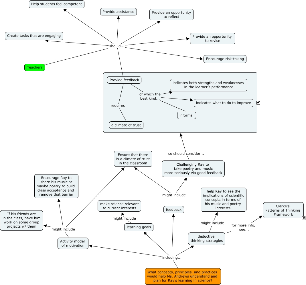 This Concept Map, created with IHMC CmapTools, has information related to: Davis.J.Engaging.Ray.1, Teachers should... Provide feedback, What concepts, principles, and practices would help Ms. Andrews understand and plan for Ray’s learning in science? including... Activity model of motivation, Provide feedback of which the best kind... indicates both strengths and weaknesses in the learner’s performance, feedback might include Challenging Ray to take poetry and music more seriously via good feedback, Challenging Ray to take poetry and music more seriously via good feedback so should consider... Provide feedback, Activity model of motivation might include If his friends are in the class, have him work on some group projects w/ them, Provide feedback of which the best kind... indicates what to do to improve, learning goals might include make science relevant to current interests, Teachers should... Encourage risk-taking, deductive thinking strategies might include help Ray to see the implications of scientific concepts in terms of his music and poetry interests., Teachers should... Provide an opportunity to reflect, Teachers should... Create tasks that are engaging, feedback might include Ensure that there is a climate of trust in the classroom, Provide feedback of which the best kind... informs, What concepts, principles, and practices would help Ms. Andrews understand and plan for Ray’s learning in science? including... deductive thinking strategies, deductive thinking strategies for more info, see... Clarke's Patterns of Thinking Framework, Teachers should... Provide an opportunity to revise, What concepts, principles, and practices would help Ms. Andrews understand and plan for Ray’s learning in science? including... learning goals, Activity model of motivation might include Ensure that there is a climate of trust in the classroom, Teachers should... Provide assistance