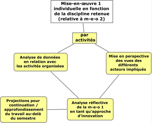 This Concept Map, created with IHMC CmapTools, has information related to: PIP_meo1, Analyse de données en relation avec les activités organisées Analyse réflective de la m-e-o 1 en tant qu’approche d’innovation, Mise-en-œuvre 1 individuelle en fonction de la discipline retenue (relative à m-e-o 2) par activités, Mise en perspective des vues des différents acteurs impliqués Analyse réflective de la m-e-o 1 en tant qu’approche d’innovation, Projections pour continuation / approfondissement du travail au-delà du semestre Analyse réflective de la m-e-o 1 en tant qu’approche d’innovation, par activités Mise en perspective des vues des différents acteurs impliqués, par activités Analyse de données en relation avec les activités organisées