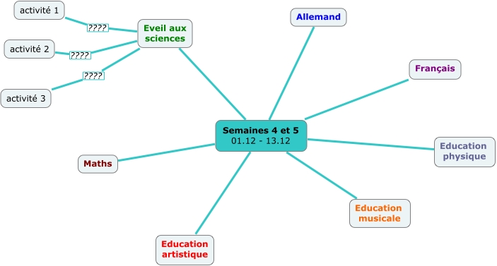 This Concept Map, created with IHMC CmapTools, has information related to: practicum_week_4_5, Semaines 4 et 5 01.12 - 13.12 Allemand, Semaines 4 et 5 01.12 - 13.12 Eveil aux sciences, Eveil aux sciences ???? activité 1, Semaines 4 et 5 01.12 - 13.12 Education physique, Eveil aux sciences ???? activité 3, Semaines 4 et 5 01.12 - 13.12 Maths, Semaines 4 et 5 01.12 - 13.12 Français, Semaines 4 et 5 01.12 - 13.12 Education artistique, Eveil aux sciences ???? activité 2, Semaines 4 et 5 01.12 - 13.12 Education musicale