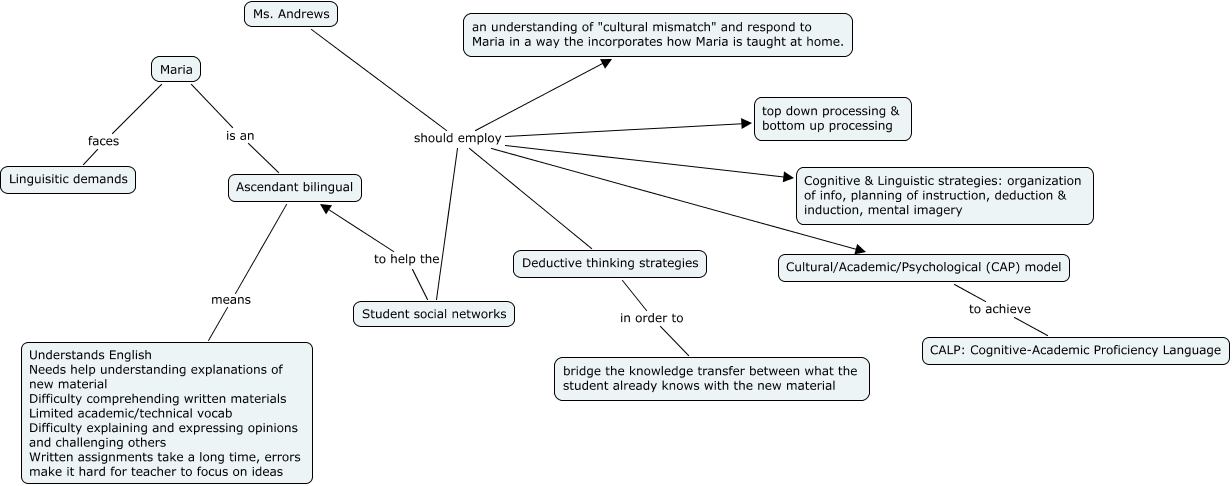 This Concept Map, created with IHMC CmapTools, has information related to: Nelson_Maria_Module 2.3, Ms. Andrews should employ Student social networks, Ms. Andrews should employ Cognitive & Linguistic strategies: organization of info, planning of instruction, deduction & induction, mental imagery, Maria faces Linguisitic demands, Deductive thinking strategies in order to bridge the knowledge transfer between what the student already knows with the new material, Maria is an Ascendant bilingual, Student social networks to help the Ascendant bilingual, Cultural/Academic/Psychological (CAP) model to achieve CALP: Cognitive-Academic Proficiency Language, Ms. Andrews should employ Deductive thinking strategies, Ms. Andrews should employ an understanding of "cultural mismatch" and respond to Maria in a way the incorporates how Maria is taught at home., Ms. Andrews should employ top down processing & bottom up processing, Ascendant bilingual means Understands English Needs help understanding explanations of new material Difficulty comprehending written materials Limited academic/technical vocab Difficulty explaining and expressing opinions and challenging others Written assignments take a long time, errors make it hard for teacher to focus on ideas, Ms. Andrews should employ Cultural/Academic/Psychological (CAP) model