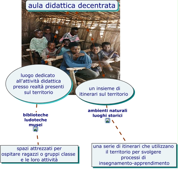 Questa Cmap, creata con IHMC CmapTools, contiene informazioni relative a: l'aula decentrata, un insieme di itinerari sul territorio ambienti naturali luoghi storici una serie di itinerari che utilizzano il territorio per svolgere processi di insegnamento-apprendimento, aula didattica decentrata è un insieme di itinerari sul territorio, luogo dedicato all'attività didattica presso realtà presenti sul territorio biblioteche ludoteche musei spazi attrezzati per ospitare ragazzi o gruppi classe e le loro attività, aula didattica decentrata è luogo dedicato all'attività didattica presso realtà presenti sul territorio
