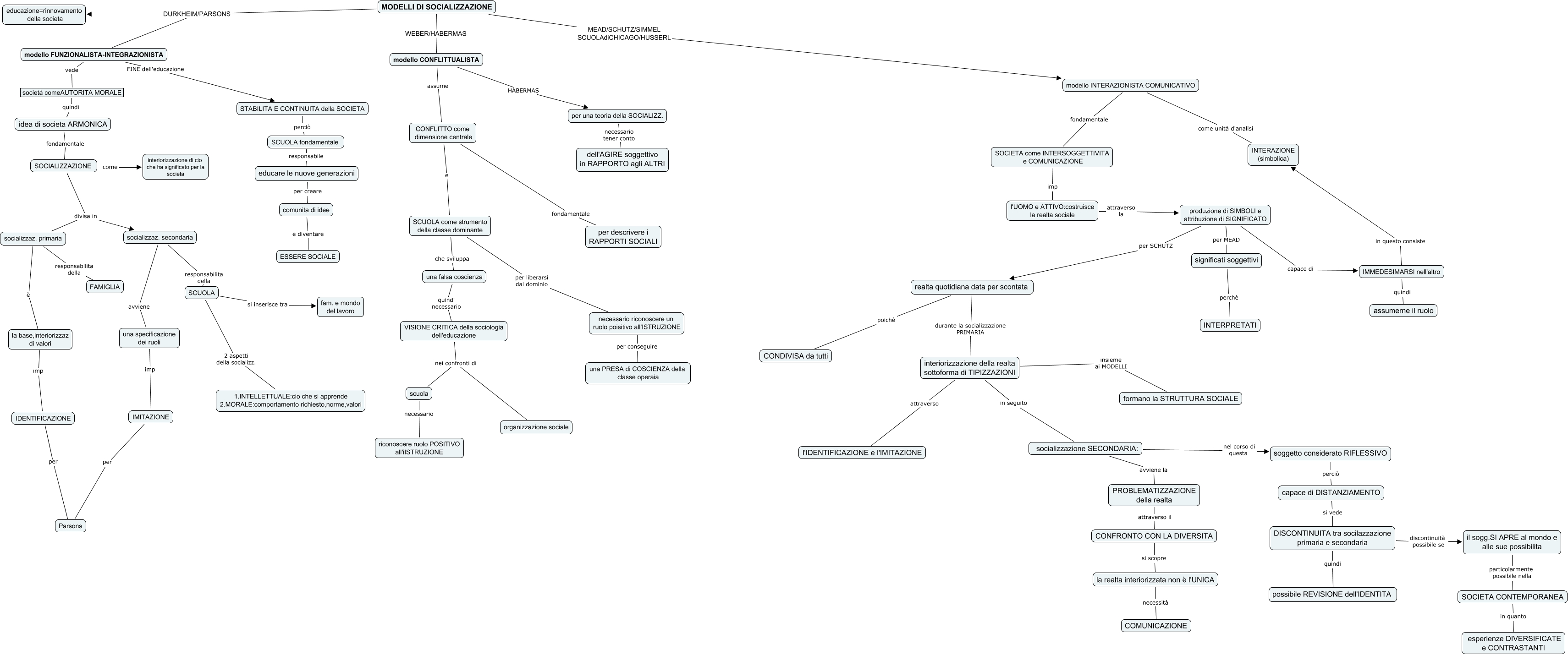 Questa Cmap, creata con IHMC CmapTools, contiene informazioni relative a: modelli di socializzazione, IDENTIFICAZIONE per Parsons, realta quotidiana data per scontata durante la socializzazione PRIMARIA interiorizzazione della realta sottoforma di TIPIZZAZIONI, modello FUNZIONALISTA-INTEGRAZIONISTA vede società comeAUTORITA MORALE, educare le nuove generazioni per creare comunita di idee, la base,interiorizzaz di valori imp IDENTIFICAZIONE, per una teoria della SOCIALIZZ. necessario tener conto dell'AGIRE soggettivo in RAPPORTO agli ALTRI, STABILITA E CONTINUITA della SOCIETA perciò SCUOLA fondamentale, DISCONTINUITA tra socilazzazione primaria e secondaria discontinuità possibile se il sogg.SI APRE al mondo e alle sue possibilita, una falsa coscienza quindi necessario VISIONE CRITICA della sociologia dell'educazione, capace di DISTANZIAMENTO si vede DISCONTINUITA tra socilazzazione primaria e secondaria, la realta interiorizzata non è l'UNICA necessità COMUNICAZIONE, socializzaz. primaria responsabilita della FAMIGLIA, produzione di SIMBOLI e attribuzione di SIGNIFICATO per SCHUTZ realta quotidiana data per scontata, necessario riconoscere un ruolo poisitivo all'ISTRUZIONE per conseguire una PRESA di COSCIENZA della classe operaia, modello INTERAZIONISTA COMUNICATIVO come unità d'analisi INTERAZIONE (simbolica), modello FUNZIONALISTA-INTEGRAZIONISTA FINE dell'educazione STABILITA E CONTINUITA della SOCIETA, interiorizzazione della realta sottoforma di TIPIZZAZIONI insieme ai MODELLI formano la STRUTTURA SOCIALE, IMITAZIONE per Parsons, MODELLI DI SOCIALIZZAZIONE MEAD/SCHUTZ/SIMMEL SCUOLAdiCHICAGO/HUSSERL modello INTERAZIONISTA COMUNICATIVO, SCUOLA si inserisce tra fam. e mondo del lavoro