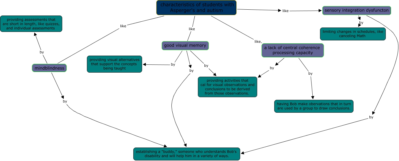 This Concept Map, created with IHMC CmapTools, has information related to: Jonas_Bob's Plan_1, mindblindness by establishing a "buddy," someone who understands Bob's disability and will help him in a variety of ways., characteristics of students with Asperger's and autism like mindblindness, a lack of central coherence processing capacity by ????, good visual memory by providing activities that cal for visual observations and conclusions to be derived from those observations., sensory integration dysfuncton by limiting changes in schedules, iike canceling Math, good visual memory by establishing a "buddy," someone who understands Bob's disability and will help him in a variety of ways., mindblindness by providing assessments that are short in length, like quizzes, and individual assessments, a lack of central coherence processing capacity by having Bob make obervations that in turn are used by a group to draw conclusions., good visual memory by providing visual alternatives that support the concepts being taught, characteristics of students with Asperger's and autism like sensory integration dysfuncton, characteristics of students with Asperger's and autism like a lack of central coherence processing capacity, sensory integration dysfuncton by establishing a "buddy," someone who understands Bob's disability and will help him in a variety of ways., characteristics of students with Asperger's and autism like good visual memory