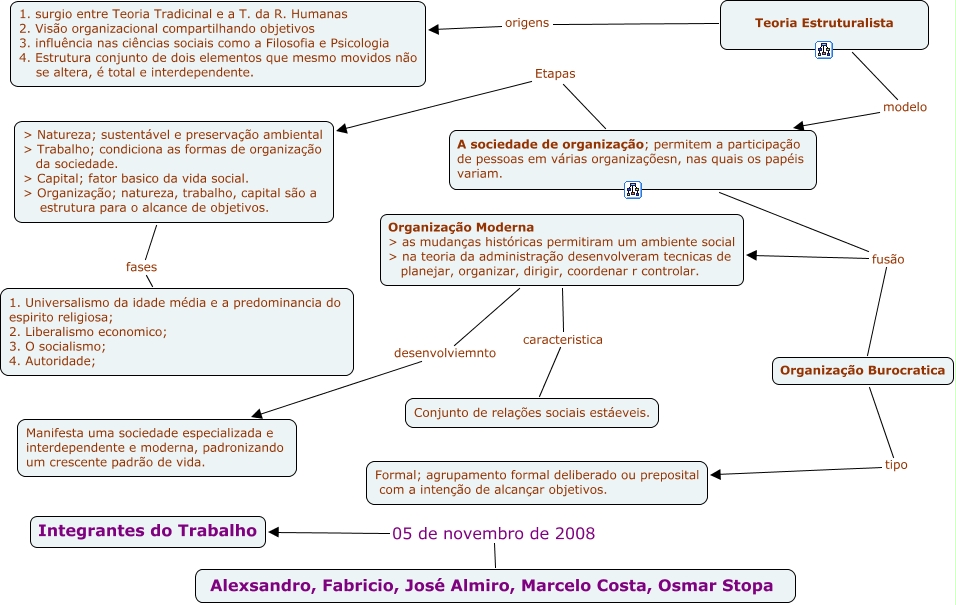 Esse mapa conceitual, produzido no IHMC CmapTools, tem a informação relacionada a: Teoria Estruturalista, A sociedade de organização; permitem a participação de pessoas em várias organizaçõesn, nas quais os papéis variam. fusão Organização Burocratica, A sociedade de organização; permitem a participação de pessoas em várias organizaçõesn, nas quais os papéis variam. Etapas > Natureza; sustentável e preservação ambiental > Trabalho; condiciona as formas de organização da sociedade. > Capital; fator basico da vida social. > Organização; natureza, trabalho, capital são a estrutura para o alcance de objetivos., Organização Burocratica tipo Formal; agrupamento formal deliberado ou preposital com a intenção de alcançar objetivos., Organização Moderna > as mudanças históricas permitiram um ambiente social > na teoria da administração desenvolveram tecnicas de planejar, organizar, dirigir, coordenar r controlar. caracteristica Conjunto de relações sociais estáeveis., Organização Moderna > as mudanças históricas permitiram um ambiente social > na teoria da administração desenvolveram tecnicas de planejar, organizar, dirigir, coordenar r controlar. desenvolviemnto Manifesta uma sociedade especializada e interdependente e moderna, padronizando um crescente padrão de vida., A sociedade de organização; permitem a participação de pessoas em várias organizaçõesn, nas quais os papéis variam. fusão Organização Moderna > as mudanças históricas permitiram um ambiente social > na teoria da administração desenvolveram tecnicas de planejar, organizar, dirigir, coordenar r controlar., > Natureza; sustentável e preservação ambiental > Trabalho; condiciona as formas de organização da sociedade. > Capital; fator basico da vida social. > Organização; natureza, trabalho, capital são a estrutura para o alcance de objetivos. fases 1. Universalismo da idade média e a predominancia do espirito religiosa; 2. Liberalismo economico; 3. O socialismo; 4. Autoridade;, Teoria Estruturalista modelo A sociedade de organização; permitem a participação de pessoas em várias organizaçõesn, nas quais os papéis variam., Teoria Estruturalista origens 1. surgio entre Teoria Tradicinal e a T. da R. Humanas 2. Visão organizacional compartilhando objetivos 3. influência nas ciências sociais como a Filosofia e Psicologia 4. Estrutura conjunto de dois elementos que mesmo movidos não se altera, é total e interdependente., Alexsandro, Fabricio, José Almiro, Marcelo Costa, Osmar Stopa 05 de novembro de 2008 Integrantes do Trabalho