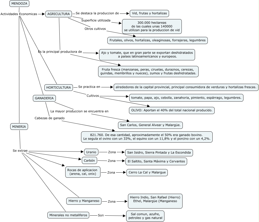 Este mapa conceptual tiene información relacionada a: Sin Título 1, Carbón Zona El Saltito, Santa Máxima y Cervantes, AGRICULTURA Superficie utilizada 300.000 hectareas de las cuales unas 140000 se utilizan para la produccion de vid, Rocas de aplicacion (arena, cal, onix) Zona Cerro La Cal y Malargue, MENDOZA Actividades Economicas GANADERIA, HORTICULTURA Se practica en alrededores de la capital provincial, principal consumidora de verduras y hortalizas frescas., AGRICULTURA Es la principal productora de Fruta fresca (manzanas, peras, ciruelas, duraznos, cerezas, guindas, membrillos y nueces), zumos y frutas deshidratadas., MINERIA Se extrae Rocas de aplicacion (arena, cal, onix), MENDOZA Actividades Economicas AGRICULTURA, AGRICULTURA Es la principal productora de Ajo y tomate, que en gran parte se exportan deshidratados a países latinoamericanos y europeos., MINERIA Se extrae Carbón