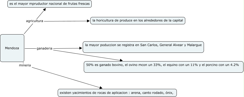 Este mapa conceptual tiene información relacionada a: jona canch, Mendoza ganaderia la mayor poduccion se registra en San Carlos, General Alvear y Malargue, Mendoza ganaderia 50% es ganado bovino, el ovino mcon un 33%, el equino con un 11% y el porcino con un 4.2%, Mendoza agricultura es el mayor mpruductor nacional de frutas frescas, Mendoza agricultura la horicultura de produce en los alrededores de la capital, Mendoza mineria existen yacimientos de rocas de aplicacion : arena, canto rodado, ónix,