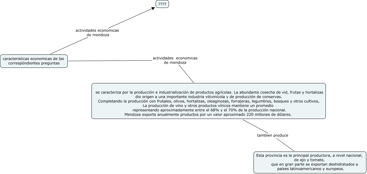 Este mapa conceptual tiene información relacionada a: agustin y richard 4 1, caracteristicas economicas de las correspòndientes preguntas actividades economicas de mendoza ????, se caracteriza por la producción e industrialización de productos agrícolas. La abundante cosecha de vid, frutas y hortalizas dio origen a una importante industria vitivinícola y de producción de conservas. Completando la producción con frutales, olivos, hortalizas, oleaginosas, forrajeras, legumbres, bosques y otros cultivos, La producción de vino y otros productos vínicos mantiene un promedio representando aproximadamente entre el 68% y el 70% de la producción nacional. Mendoza exporta anualmente productos por un valor aproximado 220 millones de dólares. tambien produce Esta provincia es la principal productora, a nivel nacional, de ajo y tomate, que en gran parte se exportan deshidratados a países latinoamericanos y europeos., caracteristicas economicas de las correspòndientes preguntas actividades economicas de mendoza se caracteriza por la producción e industrialización de productos agrícolas. La abundante cosecha de vid, frutas y hortalizas dio origen a una importante industria vitivinícola y de producción de conservas. Completando la producción con frutales, olivos, hortalizas, oleaginosas, forrajeras, legumbres, bosques y otros cultivos, La producción de vino y otros productos vínicos mantiene un promedio representando aproximadamente entre el 68% y el 70% de la producción nacional. Mendoza exporta anualmente productos por un valor aproximado 220 millones de dólares.