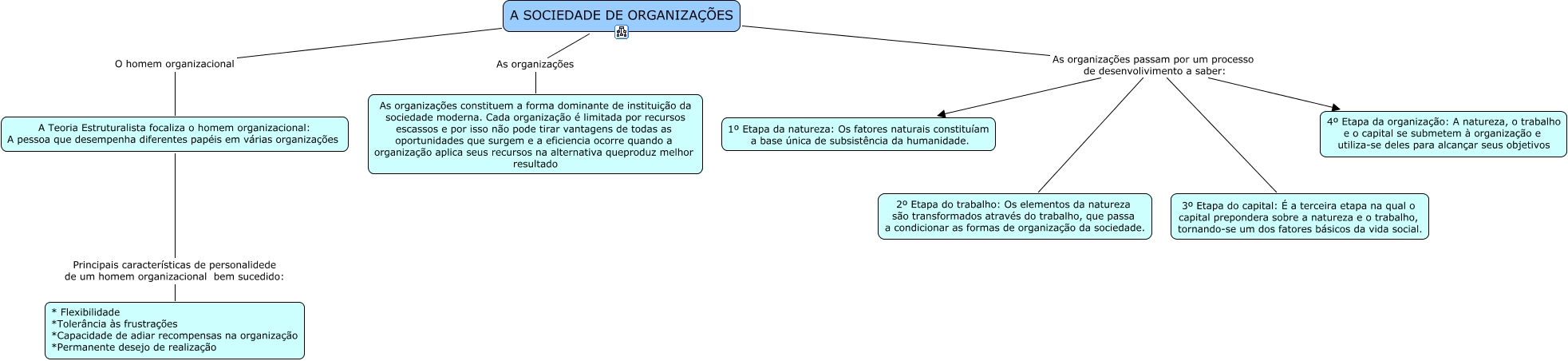 Esse mapa conceitual, produzido no IHMC CmapTools, tem a informação relacionada a: Sociedade de Organizações, A SOCIEDADE DE ORGANIZAÇÕES As organizações passam por um processo de desenvolivimento a saber: 4º Etapa da organização: A natureza, o trabalho e o capital se submetem à organização e utiliza-se deles para alcançar seus objetivos, A SOCIEDADE DE ORGANIZAÇÕES As organizações passam por um processo de desenvolivimento a saber: 3º Etapa do capital: É a terceira etapa na qual o capital prepondera sobre a natureza e o trabalho, tornando-se um dos fatores básicos da vida social., A SOCIEDADE DE ORGANIZAÇÕES As organizações passam por um processo de desenvolivimento a saber: 1º Etapa da natureza: Os fatores naturais constituíam a base única de subsistência da humanidade., A Teoria Estruturalista focaliza o homem organizacional: A pessoa que desempenha diferentes papéis em várias organizações Principais características de personalidede de um homem organizacional bem sucedido: * Flexibilidade *Tolerância às frustrações *Capacidade de adiar recompensas na organização *Permanente desejo de realização, A SOCIEDADE DE ORGANIZAÇÕES As organizações As organizações constituem a forma dominante de instituição da sociedade moderna. Cada organização é limitada por recursos escassos e por isso não pode tirar vantagens de todas as oportunidades que surgem e a eficiencia ocorre quando a organização aplica seus recursos na alternativa queproduz melhor resultado, A SOCIEDADE DE ORGANIZAÇÕES O homem organizacional A Teoria Estruturalista focaliza o homem organizacional: A pessoa que desempenha diferentes papéis em várias organizações, A SOCIEDADE DE ORGANIZAÇÕES As organizações passam por um processo de desenvolivimento a saber: 2º Etapa do trabalho: Os elementos da natureza são transformados através do trabalho, que passa a condicionar as formas de organização da sociedade.