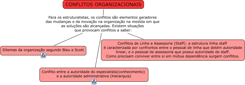 Esse mapa conceitual, produzido no IHMC CmapTools, tem a informação relacionada a: Conflitos Organizacionais Teoria Estruturalista, CONFLITOS ORGANIZACIONAIS Para os estruturalistas, os conflitos são elementos geradores das mudanças e da inovação na organização na medida em que as soluções são alcançadas. Existem situações que provocam conflitos a saber: Conflito entre a autoridade do especialista(conhecimento) e a autoridade administrativa (hierarquia), CONFLITOS ORGANIZACIONAIS Para os estruturalistas, os conflitos são elementos geradores das mudanças e da inovação na organização na medida em que as soluções são alcançadas. Existem situações que provocam conflitos a saber: Dilemas da organização segundo Blau e Scott, CONFLITOS ORGANIZACIONAIS Para os estruturalistas, os conflitos são elementos geradores das mudanças e da inovação na organização na medida em que as soluções são alcançadas. Existem situações que provocam conflitos a saber: Conflitos de Linha e Assessoria (Staff): a estrutura linha staff é caracterizada por confrontos entre o pessoal de linha que detém autoridade linear, e o pessoal de assessoria que possui autoridade de staff. Como precisam conviver entre si em mútua dependência surgem conflitos.