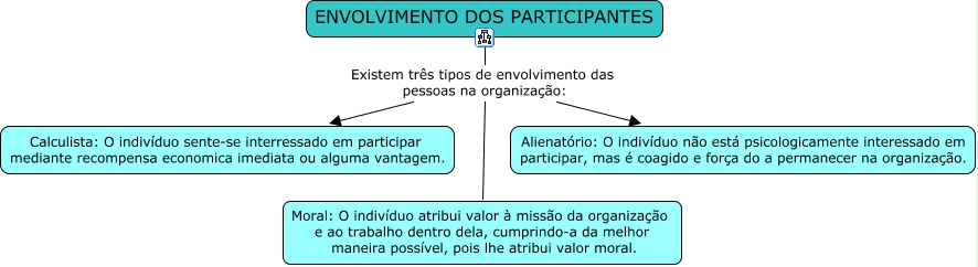 Esse mapa conceitual, produzido no IHMC CmapTools, tem a informação relacionada a: Envolvimento dos Participantes, ENVOLVIMENTO DOS PARTICIPANTES Existem três tipos de envolvimento das pessoas na organização: Calculista: O indivíduo sente-se interressado em participar mediante recompensa economica imediata ou alguma vantagem., ENVOLVIMENTO DOS PARTICIPANTES Existem três tipos de envolvimento das pessoas na organização: Moral: O indivíduo atribui valor à missão da organização e ao trabalho dentro dela, cumprindo-a da melhor maneira possível, pois lhe atribui valor moral., ENVOLVIMENTO DOS PARTICIPANTES Existem três tipos de envolvimento das pessoas na organização: Alienatório: O indivíduo não está psicologicamente interessado em participar, mas é coagido e força do a permanecer na organização.