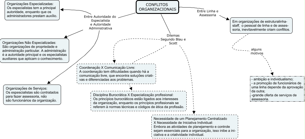 Esse mapa conceitual, produzido no IHMC CmapTools, tem a informação relacionada a: Conflitos Organizacionais, CONFLITOS ORGANIZACIONAIS Entre Autoridade do Especialista e Autoridade Administrativa Organizações de Serviços: Os espescialistas são contratados para fazer assessoria, não são funcionários da organização., CONFLITOS ORGANIZACIONAIS Dilemas Segundo Blau e Scott Disciplina Burocrática X Especialização profissional: Os princípios burocráticos estão ligados aos interesses da organização, enquanto os princípios profissionais se referem à normas técnicas e códigos de ética da profissão., CONFLITOS ORGANIZACIONAIS Entre Autoridade do Especialista e Autoridade Administrativa Organizações Especializadas: Os especialistas tem a principal autoridade, enquanto que os administradores prestam auxílio., CONFLITOS ORGANIZACIONAIS Dilemas Segundo Blau e Scott Coordenação X Comunicação Livre: A coordenação tem dificuldades quando há a comunicação livre, que encontra soluções criati- vas e diferenciadas aos problemas., CONFLITOS ORGANIZACIONAIS Dilemas Segundo Blau e Scott Necessidade de um Planejamento Centralizado X Necessidade de Iniciativa Individual: Embora as atividades de planejamento e controle sejam essenciais para a organização, isso inibe a ini- ciativa e a criatividade individual., Em organizações de estruturalinha- staff, o pessoal de linha e de asses- soria, inevitavelmente criam conflitos. alguns motivos - ambição e individualismo; - a promoção de funcionários de uma linha depende da aprovação da outra; -grande oferta de serviços de assessoria., CONFLITOS ORGANIZACIONAIS Entre Autoridade do Especialista e Autoridade Administrativa Organizações Não Especializadas: São organizações de propriedade e administração particular. A administração é a autoridade principal e os especialistas auxiliares que aplicam o conhecimento., CONFLITOS ORGANIZACIONAIS Entre Linha e Assessoria Em organizações de estruturalinha- staff, o pessoal de linha e de asses- soria, inevitavelmente criam conflitos.