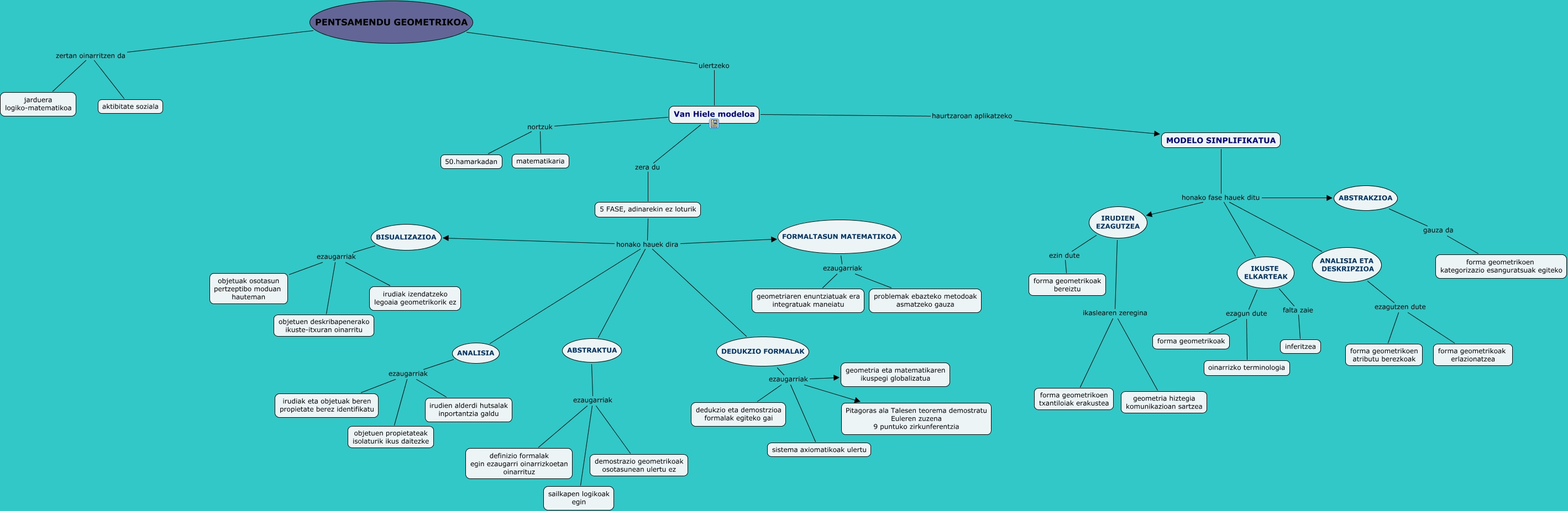 Este Cmap, tiene información relacionada con: garcia_saratxaga_garazi2, MODELO SINPLIFIKATUA honako fase hauek ditu IRUDIEN EZAGUTZEA, DEDUKZIO FORMALAK ezaugarriak sistema axiomatikoak ulertu, IKUSTE ELKARTEAK ezagun dute oinarrizko terminologia, ABSTRAKTUA ezaugarriak sailkapen logikoak egin, 5 FASE, adinarekin ez loturik honako hauek dira BISUALIZAZIOA, MODELO SINPLIFIKATUA honako fase hauek ditu ANALISIA ETA DESKRIPZIOA, PENTSAMENDU GEOMETRIKOA zertan oinarritzen da aktibitate soziala, IKUSTE ELKARTEAK ezagun dute forma geometrikoak, Van Hiele modeloa nortzuk 50.hamarkadan, 5 FASE, adinarekin ez loturik honako hauek dira ANALISIA, PENTSAMENDU GEOMETRIKOA ulertzeko Van Hiele modeloa, ABSTRAKZIOA gauza da forma geometrikoen kategorizazio esanguratsuak egiteko, PENTSAMENDU GEOMETRIKOA zertan oinarritzen da jarduera logiko-matematikoa, DEDUKZIO FORMALAK ezaugarriak Pitagoras ala Talesen teorema demostratu Euleren zuzena 9 puntuko zirkunferentzia, IKUSTE ELKARTEAK falta zaie inferitzea, MODELO SINPLIFIKATUA honako fase hauek ditu ABSTRAKZIOA, Van Hiele modeloa zera du 5 FASE, adinarekin ez loturik, ANALISIA ezaugarriak irudien alderdi hutsalak inportantzia galdu, BISUALIZAZIOA ezaugarriak objetuen deskribapenerako ikuste-itxuran oinarritu, ANALISIA ETA DESKRIPZIOA ezagutzen dute forma geometrikoak erlazionatzea
