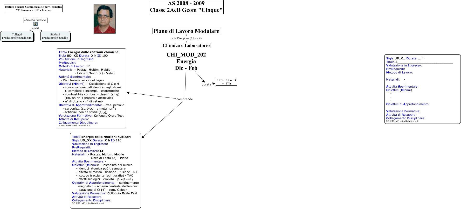 Questa Cmap, creata con IHMC CmapTools, contiene informazioni relative a: CHI_MOD_202 Energia - Dic - Feb, Marcello Preziuso email Colleghi preziusom@hotmail.com, CHI_MOD_202 Energia Dic - Feb comprende Titolo Energia dalle reazioni nucleari Sigla UD_XX Durata X h ID 110 Valutazione in Ingresso: PreRequisiti: Metodo di Lavoro: LF Materiali: - Postaz. Multim. Mobile - Libro di Testo (2) - Video Attività Sperimentale:- Obiettivi (Minimi): - instabilità del nucleo - identità atomica può trasmutare - difetto di massa - fissione - fusione - RX - isotopo tracciante (scintigrafia) - TAC - effetti biologici - emivita - p. α β - rad γ Obiettivi di Approfondimento: - confinamento magnetico - schema centrale elettro-nuc. - datazione al C(14) - cont. Geiger - Valutazione Formativa: Colloquio Orale Test Attività di Recupero: Collegamento Disciplinare: SCHEDA dell' Unità Didattica v.6, CHI_MOD_202 Energia Dic - Feb comprende Titolo Energia dalle reazioni chimiche Sigla UD_XX Durata X h ID 100 Valutazione in Ingresso: PreRequisiti: Metodo di Lavoro: LF Materiali: - Postaz. Multim. Mobile - Libro di Testo (2) - Video Attività Sperimentale: - Distillazione secca del legno Obiettivi (Minimi): - Ossidazione di C e H - conservazione dell'identità degli atomi - r. complete e incompl. - esotermiche - combustibile combur. - classif. (s l g) (rin. nn rin.) (naturale artificiale) - n° di ottano - n° di cetano Obiettivi di Approfondimento: - fraz. petrolio - carbonizz. (st. bioch. e metamorf.) - artificiali non da fossili (s,l,g) Valutazione Formativa: Colloquio Orale Test Attività di Recupero: Collegamento Disciplinare: SCHEDA dell' Unità Didattica v.6, CHI_MOD_202 Energia Dic - Feb durata 5 + 3 + 5 + 4 + 4 = 17 h, Marcello Preziuso email Studenti preziusom@hotmail.it, Piano di Lavoro Modulare della Disciplina (3 h / sett) Chimica e Laboratorio