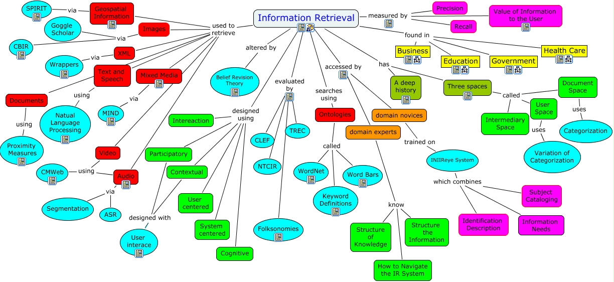 This Concept Map, created with IHMC CmapTools, has information related to: Information Retrieval, Information Retrieval evaluated by NTCIR, Information Retrieval designed using Intereaction, Images via Goggle Scholar, Audio via Segmentation, Three spaces called Intermediary Space, Information Retrieval altered by Belief Revision Theory, INIIReye System which combines Subject Cataloging, Information Retrieval designed using User centered, Information Retrieval has Three spaces, Information Retrieval evaluated by CLEF, User interace designed with Contextual, Information Retrieval measured by Precision, Information Retrieval found in Health Care, Information Retrieval used to retrieve Video, Ontologies called Word Bars, Information Retrieval used to retrieve Geospatial Information, Ontologies called WordNet, Information Retrieval found in Business, Information Retrieval evaluated by Folksonomies, Information Retrieval used to retrieve Text and Speech