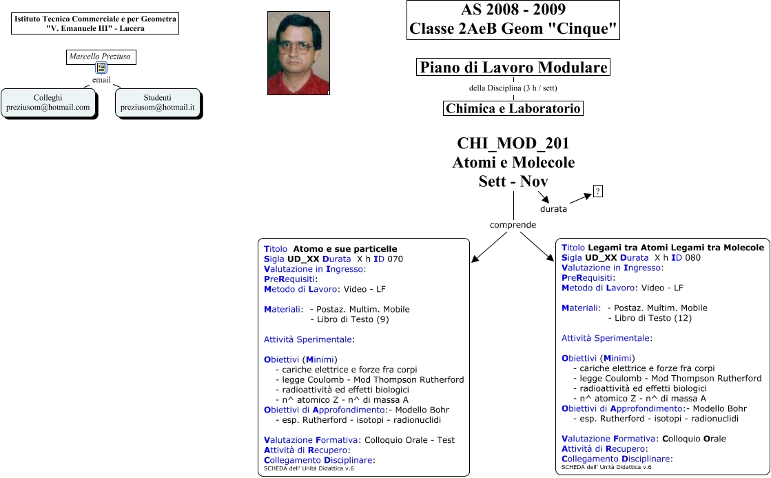 Questa Cmap, creata con IHMC CmapTools, contiene informazioni relative a: CHI_MOD_201 Atomi e Molecole - Sett - Nov, Marcello Preziuso email Colleghi preziusom@hotmail.com, CHI_MOD_201 Atomi e Molecole Sett - Nov comprende Titolo Legami tra Atomi Legami tra Molecole Sigla UD_XX Durata X h ID 080 Valutazione in Ingresso: PreRequisiti: Metodo di Lavoro: Video - LF Materiali: - Postaz. Multim. Mobile - Libro di Testo (12) Attività Sperimentale: Obiettivi (Minimi) - cariche elettrice e forze fra corpi - legge Coulomb - Mod Thompson Rutherford - radioattività ed effetti biologici - n^ atomico Z - n^ di massa A Obiettivi di Approfondimento:- Modello Bohr - esp. Rutherford - isotopi - radionuclidi Valutazione Formativa: Colloquio Orale Attività di Recupero: Collegamento Disciplinare: SCHEDA dell' Unità Didattica v.6, CHI_MOD_201 Atomi e Molecole Sett - Nov durata ?, CHI_MOD_201 Atomi e Molecole Sett - Nov comprende Titolo Atomo e sue particelle Sigla UD_XX Durata X h ID 070 Valutazione in Ingresso: PreRequisiti: Metodo di Lavoro: Video - LF Materiali: - Postaz. Multim. Mobile - Libro di Testo (9) Attività Sperimentale: Obiettivi (Minimi) - cariche elettrice e forze fra corpi - legge Coulomb - Mod Thompson Rutherford - radioattività ed effetti biologici - n^ atomico Z - n^ di massa A Obiettivi di Approfondimento:- Modello Bohr - esp. Rutherford - isotopi - radionuclidi Valutazione Formativa: Colloquio Orale - Test Attività di Recupero: Collegamento Disciplinare: SCHEDA dell' Unità Didattica v.6, Marcello Preziuso email Studenti preziusom@hotmail.it, Piano di Lavoro Modulare della Disciplina (3 h / sett) Chimica e Laboratorio