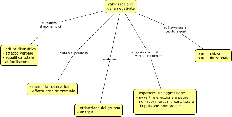 Questa Cmap, creata con IHMC CmapTools, contiene informazioni relative a: valorizzazione negatività-la critica al facilitatore, valorizzazione della negatività evidenzia - attivazione del gruppo - energia, valorizzazione della negatività suggerisce al facilitatore vari apprendimenti - aspettarsi un'aggressione - avvertire emozione e paura - non reprimere, ma canalizzare la pulsione primordiale, valorizzazione della negatività può avvalersi di tecniche quali parola chiave parola direzionale, valorizzazione della negatività aiuta a superare la - memoria traumatica - effetto orda primordiale, valorizzazione della negatività si realizza nel momento di - critica distruttiva - attacco verbale - squalifica totale al facilitatore