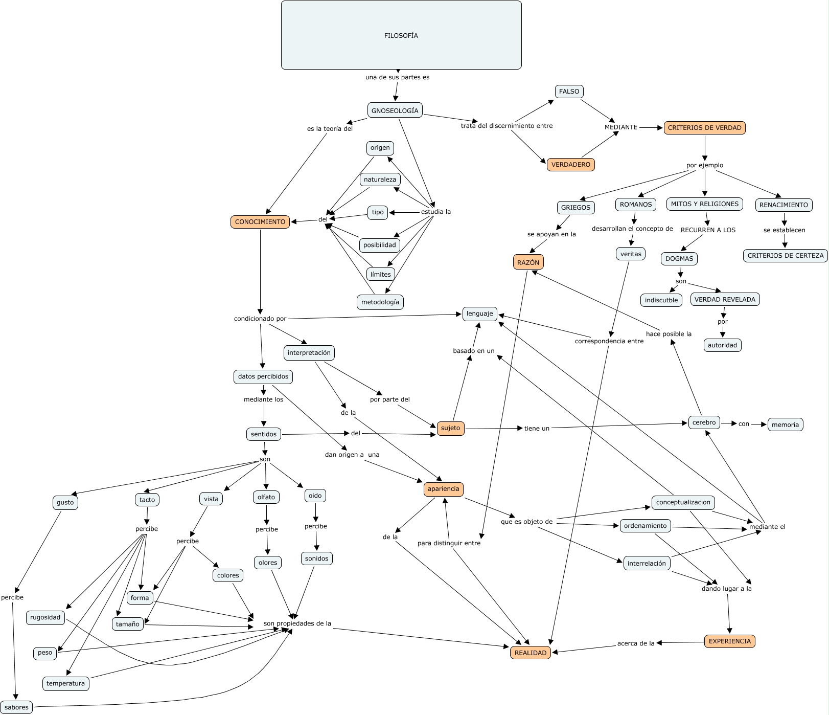 Este Cmap, tiene información relacionada con: GNOSEOLOGÍA, sujeto tiene un cerebro, conceptualizacion mediante el cerebro, interrelación mediante el lenguaje, GNOSEOLOGÍA estudia la posibilidad, sujeto basado en un lenguaje, GRIEGOS se apoyan en la RAZÓN, oido percibe sonidos, ordenamiento mediante el lenguaje, conceptualizacion dando lugar a la EXPERIENCIA, conceptualizacion basado en un lenguaje, tipo del CONOCIMIENTO, sentidos del sujeto, apariencia que es objeto de interrelación, RAZÓN para distinguir entre REALIDAD, sentidos son gusto, GNOSEOLOGÍA estudia la naturaleza, FALSO MEDIANTE CRITERIOS DE VERDAD, veritas correspondencia entre lenguaje, ordenamiento dando lugar a la EXPERIENCIA, GNOSEOLOGÍA estudia la tipo
