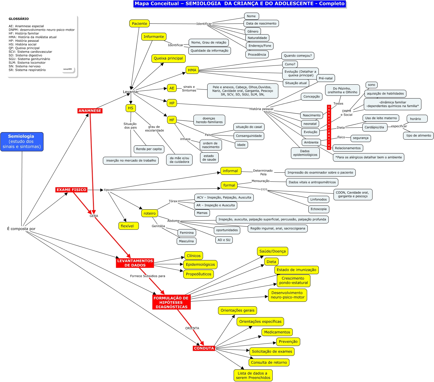 Esse mapa conceitual, produzido no IHMC CmapTools, tem a informação relacionada a: semiologia da crianca e do adolescente - completo, roteiro Tórax ACV – Inspeção, Palpação, Ausculta, ANAMNESE Levantar HF, Semiologia (estudo dos sinais e sintomas) É composta por ANAMNESE, Ambiente * Relacionamentos, LEVANTAMENTOS DE DADOS ???? Epidemiológicos, CONDUTA ???? Consulta de retorno, roteiro Genitália Feminina, Paciente Identificar Data de nascimento, Informante Identificar Qualidade da informação, formal ???? Ectoscopia, formal ???? Linfonodos, HS grau de escolaridade da mãe e/ou da cuidadora, Paciente Levantar AE, formal ???? COON, Cavidade oral, garganta e pescoço, HP História pessoal Ambiente, HP História pessoal neonatal, EXAME FISICO tipo formal, Evolução DNPM e Social aquisição de habilidades, HMA * Evolução (Detalhar a queixa principal), HF irmaos estado de saude