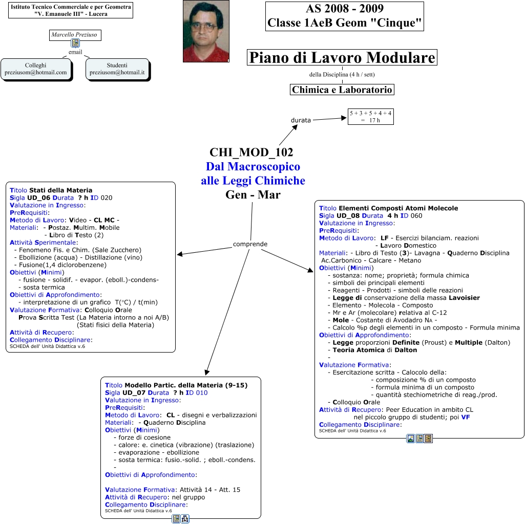 Questa Cmap, creata con IHMC CmapTools, contiene informazioni relative a: CHI_MOD_102 Dal Macroscopico alle Leggi Chimiche, CHI_MOD_102 Dal Macroscopico alle Leggi Chimiche Gen - Mar comprende Titolo Elementi Composti Atomi Molecole Sigla UD_08 Durata 4 h ID 060 Valutazione in Ingresso: PreRequisiti: Metodo di Lavoro: LF - Esercizi bilanciam. reazioni - Lavoro Domestico Materiali: - Libro di Testo (3)- Lavagna - Quaderno Disciplina Ac.Carbonico - Calcare - Metano Obiettivi (Minimi) - sostanza: nome; proprietà; formula chimica - simboli dei principali elementi - Reagenti - Prodotti - simboli delle reazioni - Legge di conservazione della massa Lavoisier - Elemento - Molecola - Composto - Mr e Ar (molecolare) relativa al C-12 - Mole - Costante di Avodadro NA - - Calcolo %p degli elementi in un composto - Formula minima Obiettivi di Approfondimento: - Legge proporzioni Definite (Proust) e Multiple (Dalton) - Teoria Atomica di Dalton - Valutazione Formativa: - Esercitazione scritta - Calocolo della: - composizione % di un composto - formula minima di un composto - quantità stechiometriche di reag./prod. - Colloquio Orale Attività di Recupero: Peer Education in ambito CL nel piccolo gruppo di studenti; poi VF Collegamento Disciplinare: SCHEDA dell' Unità Didattica v.6, Marcello Preziuso email Colleghi preziusom@hotmail.com, CHI_MOD_102 Dal Macroscopico alle Leggi Chimiche Gen - Mar comprende Titolo Modello Partic. della Materia (9-15) Sigla UD_07 Durata ? h ID 010 Valutazione in Ingresso: PreRequisiti: Metodo di Lavoro: CL - disegni e verbalizzazioni Materiali: - Quaderno Disciplina Obiettivi (Minimi) - forze di coesione - calore: e. cinetica (vibrazione) (traslazione) - evaporazione - ebollizione - sosta termica: fusio.-solid. ; eboll.-condens. - Obiettivi di Approfondimento: Valutazione Formativa: Attività 14 - Att. 15 Attività di Recupero: nel gruppo Collegamento Disciplinare: SCHEDA dell' Unità Didattica v.6, CHI_MOD_102 Dal Macroscopico alle Leggi Chimiche Gen - Mar comprende Titolo Stati della Materia Sigla UD_06 Durata ? h ID 020 Valutazione in Ingresso: PreRequisiti: Metodo di Lavoro: Video - CL MC - Materiali: - Postaz. Multim. Mobile - Libro di Testo (2) Attività Sperimentale: - Fenomeno Fis. e Chim. (Sale Zucchero) - Ebollizione (acqua) - Distillazione (vino) - Fusione(1,4 diclorobenzene) Obiettivi (Minimi) - fusione - solidif. - evapor. (eboll.)-condens- - sosta termica Obiettivi di Approfondimento: - interpretazione di un grafico T(°C) / t(min) Valutazione Formativa: Colloquio Orale Prova Scritta Test (La Materia intorno a noi A/B) (Stati fisici della Materia) Attività di Recupero: Collegamento Disciplinare: SCHEDA dell' Unità Didattica v.6, CHI_MOD_102 Dal Macroscopico alle Leggi Chimiche Gen - Mar durata 5 + 3 + 5 + 4 + 4 = 17 h, Marcello Preziuso email Studenti preziusom@hotmail.it, Piano di Lavoro Modulare della Disciplina (4 h / sett) Chimica e Laboratorio