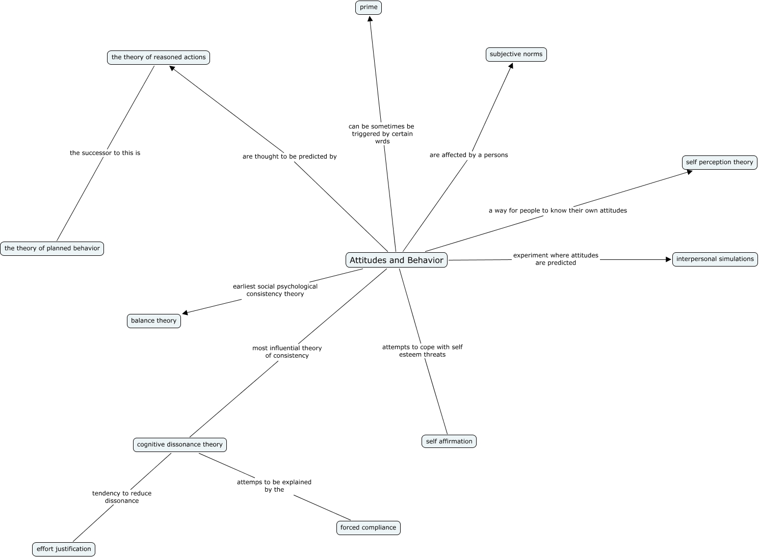 This Concept Map, created with IHMC CmapTools, has information related to: Attitudes and Behavior, Attitudes and Behavior a way for people to know their own attitudes self perception theory, Attitudes and Behavior can be sometimes be triggered by certain wrds prime, Attitudes and Behavior are affected by a persons subjective norms, Attitudes and Behavior most influential theory of consistency cognitive dissonance theory, Attitudes and Behavior experiment where attitudes are predicted interpersonal simulations, cognitive dissonance theory tendency to reduce dissonance effort justification, Attitudes and Behavior are thought to be predicted by the theory of reasoned actions, the theory of reasoned actions the successor to this is the theory of planned behavior, Attitudes and Behavior attempts to cope with self esteem threats self affirmation, Attitudes and Behavior earliest social psychological consistency theory balance theory, cognitive dissonance theory attemps to be explained by the forced compliance