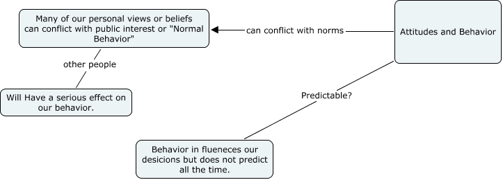 This Concept Map, created with IHMC CmapTools, has information related to: attitudes and Behavior, Attitudes and Behavior Predictable? Behavior in flueneces our desicions but does not predict all the time., Attitudes and Behavior can conflict with norms Many of our personal views or beliefs can conflict with public interest or "Normal Behavior", Many of our personal views or beliefs can conflict with public interest or "Normal Behavior" other people Will Have a serious effect on our behavior.