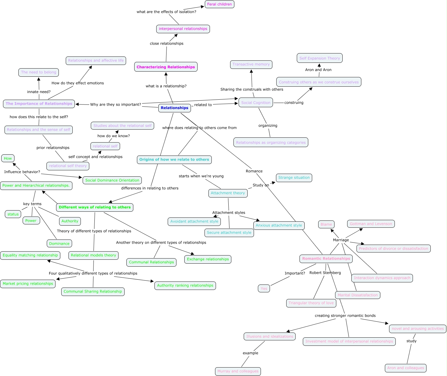 This Concept Map, created with IHMC CmapTools, has information related to: Relationships, Romantic Relationships Marriage Predictors of divorce or dissatisfaction, Different ways of relating to others Theory of different types of relationships Relational models theory, Relationships differences in relating to others Different ways of relating to others, Power and Hierarchical relationships. key terms Power, The Importance of Relationships innate need? The need to belong, Romantic Relationships creating stronger romantic bonds novel and arousing activities, Social Cognition organizing Relationships as organizing categories, Romantic Relationships Marriage Interaction dynamics approach, Social Cognition construing Construing others as we construe ourselves, Different ways of relating to others Power Power and Hierarchical relationships., The Importance of Relationships How do they effect emotions Relationships and affective life, Relationships what is a relationship? Characterizing Relationships, Attachment theory Attachment styles Secure attachment style, Relational models theory Four qualitatively different types of relationships Equality matching relationship, Romantic Relationships Important? Yes, Romantic Relationships creating stronger romantic bonds Investment model of interpersonal relationships, Power and Hierarchical relationships. Influence behavior? Social Dominance Orientation, Relationships Why are they so important? Social Cognition, Romantic Relationships creating stronger romantic bonds Illusions and idealizations, Power and Hierarchical relationships. key terms Authority