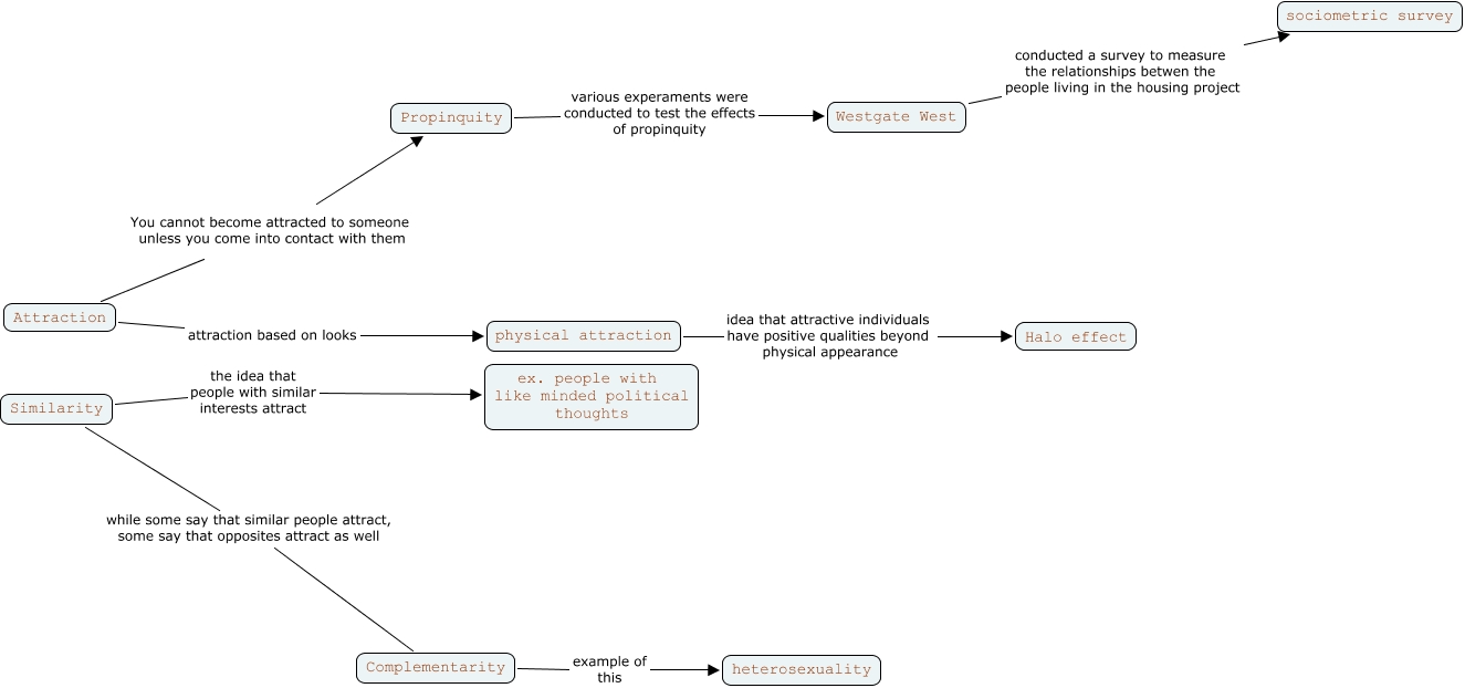 This Concept Map, created with IHMC CmapTools, has information related to: Attraction and Propinquinty, Complementarity example of this heterosexuality, Similarity the idea that people with similar interests attract ex. people with like minded political thoughts, Attraction You cannot become attracted to someone unless you come into contact with them Propinquity, physical attraction idea that attractive individuals have positive qualities beyond physical appearance Halo effect, Similarity while some say that similar people attract, some say that opposites attract as well Complementarity, Propinquity various experaments were conducted to test the effects of propinquity Westgate West, Attraction attraction based on looks physical attraction, Westgate West conducted a survey to measure the relationships betwen the people living in the housing project sociometric survey