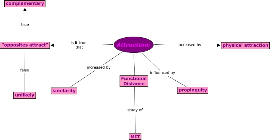 This Concept Map, created with IHMC CmapTools, has information related to: Attraction, Attraction Study Functional Distance, Attraction increased by similarity, "opposites attract" true complementary, Attraction is it true that "opposites attract", Attraction influenced by propinquity, Attraction increased by physical attraction, "opposites attract" false unlikely, Functional Distance study of MIT