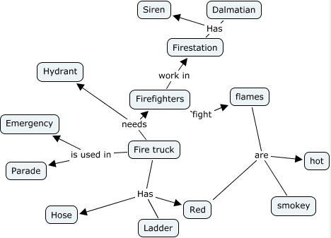 This Concept Map, created with IHMC CmapTools, has information related to: Firetruck, flames are smokey, Firestation Has Dalmatian, Fire truck is used in Parade, Firefighters work in Firestation, Fire truck Has Hose, Fire truck needs Hydrant, Firestation Has Siren, Fire truck is used in Emergency, flames are hot, Firefighters fight flames, flames are Red, Fire truck Has Ladder, Fire truck needs Firefighters, Fire truck Has Red