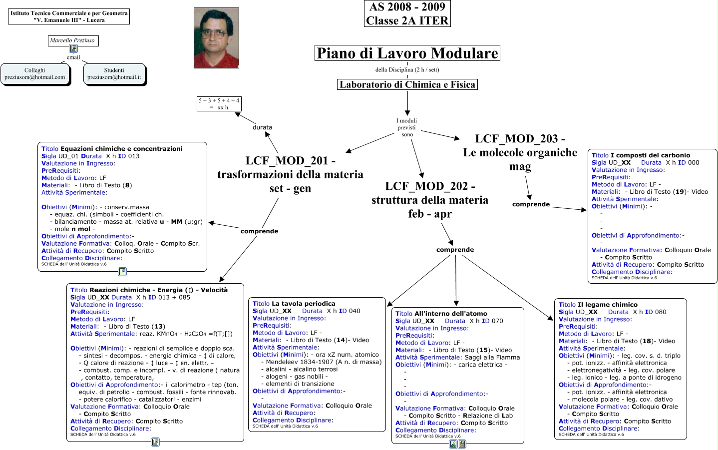 Questa Cmap, creata con IHMC CmapTools, contiene informazioni relative a: LCF_MOD_201_2_3, Marcello Preziuso email Colleghi preziusom@hotmail.com, Laboratorio di Chimica e Fisica I moduli previsti sono LCF_MOD_201 - trasformazioni della materia set - gen, Laboratorio di Chimica e Fisica I moduli previsti sono LCF_MOD_202 - struttura della materia feb - apr, LCF_MOD_203 - Le molecole organiche mag comprende Titolo I composti del carbonio Sigla UD_XX Durata X h ID 000 Valutazione in Ingresso: PreRequisiti: Metodo di Lavoro: LF - Materiali: - Libro di Testo (19)- Video Attività Sperimentale: Obiettivi (Minimi): - - - - Obiettivi di Approfondimento:- - Valutazione Formativa: Colloquio Orale - Compito Scritto Attività di Recupero: Compito Scritto Collegamento Disciplinare: SCHEDA dell' Unità Didattica v.6, LCF_MOD_202 - struttura della materia feb - apr comprende Titolo All'interno dell'atomo Sigla UD_XX Durata X h ID 070 Valutazione in Ingresso: PreRequisiti: Metodo di Lavoro: LF - Materiali: - Libro di Testo (15)- Video Attività Sperimentale: Saggi alla Fiamma Obiettivi (Minimi): - carica elettrica - - - - Obiettivi di Approfondimento:- - Valutazione Formativa: Colloquio Orale - Compito Scritto - Relazione di Lab Attività di Recupero: Compito Scritto Collegamento Disciplinare: SCHEDA dell' Unità Didattica v.6, Laboratorio di Chimica e Fisica I moduli previsti sono LCF_MOD_203 - Le molecole organiche mag, LCF_MOD_202 - struttura della materia feb - apr comprende Titolo Il legame chimico Sigla UD_XX Durata X h ID 080 Valutazione in Ingresso: PreRequisiti: Metodo di Lavoro: LF - Materiali: - Libro di Testo (18)- Video Attività Sperimentale: Obiettivi (Minimi): - leg. cov. s. d. triplo - pot. ionizz. - affinità elettronica - elettronegatività - leg. cov. polare - leg. ionico - leg. a ponte di idrogeno Obiettivi di Approfondimento:- - pot. ionizz. - affinità elettronica - molecola polare - leg. cov. dativo Valutazione Formativa: Colloquio Orale - Compito Scritto Attività di Recupero: Compito Scritto Collegamento Disciplinare: SCHEDA dell' Unità Didattica v.6, LCF_MOD_201 - trasformazioni della materia set - gen durata 5 + 3 + 5 + 4 + 4 = xx h, LCF_MOD_201 - trasformazioni della materia set - gen comprende Titolo Reazioni chimiche - Energia (↕) - Velocità Sigla UD_XX Durata X h ID 013 + 085 Valutazione in Ingresso: PreRequisiti: Metodo di Lavoro: LF Materiali: - Libro di Testo (13) Attività Sperimentale: reaz. KMnO4 - H2C2O4 =f(T;[]) Obiettivi (Minimi): - reazioni di semplice e doppio sca. - sintesi - decompos. - energia chimica - ↕ di calore, - Q calore di reazione - ↕ luce - ↕ en. elettr. - - combust. comp. e incompl. - v. di reazione ( natura , contatto, temperatura, Obiettivi di Approfondimento:- il calorimetro - tep (ton. equiv. di petrolio - combust. fossili - fonte rinnovab. - potere calorifico - catalizzatori - enzimi Valutazione Formativa: Colloquio Orale - Compito Scritto Attività di Recupero: Compito Scritto Collegamento Disciplinare: SCHEDA dell' Unità Didattica v.6, LCF_MOD_201 - trasformazioni della materia set - gen comprende Titolo Equazioni chimiche e concentrazioni Sigla UD_01 Durata X h ID 013 Valutazione in Ingresso: PreRequisiti: Metodo di Lavoro: LF Materiali: - Libro di Testo (8) Attività Sperimentale: Obiettivi (Minimi): - conserv.massa - equaz. chi. (simboli - coefficienti ch. - bilanciamento - massa at. relativa u - MM (u;gr) - mole n mol - Obiettivi di Approfondimento:- Valutazione Formativa: Colloq. Orale - Compito Scr. Attività di Recupero: Compito Scritto Collegamento Disciplinare: SCHEDA dell' Unità Didattica v.6, Marcello Preziuso email Studenti preziusom@hotmail.it, LCF_MOD_202 - struttura della materia feb - apr comprende Titolo La tavola periodica Sigla UD_XX Durata X h ID 040 Valutazione in Ingresso: PreRequisiti: Metodo di Lavoro: LF - Materiali: - Libro di Testo (14)- Video Attività Sperimentale: Obiettivi (Minimi): - ora xZ num. atomico - Mendeleev 1834-1907 (A n. di massa) - alcalini - alcalino terrosi - alogeni - gas nobili - - elementi di transizione Obiettivi di Approfondimento:- - Valutazione Formativa: Colloquio Orale Attività di Recupero: Collegamento Disciplinare: SCHEDA dell' Unità Didattica v.6, Piano di Lavoro Modulare della Disciplina (2 h / sett) Laboratorio di Chimica e Fisica