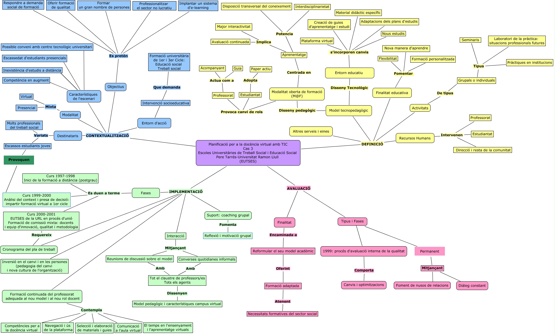 Este Cmap, tiene información relacionada con: CAS 3 EUTSES, Interacció Mitjançant Reunions de discussió sobre el model, Objectius Es pretén Oferir formació de qualitat, Reformular el seu model acadèmic Oferint Formació adaptada, Planificació per a la docència virtual amb TIC Cas 3 Escoles Universitàries de Treball Social i Educació Social Pere Tarrés-Universitat Ramon Llull (EUTSES) AVALUACIÓ Tipus i Fases, Finalitat educativa Fomentar Formació personalitzada, Professorat Actua com a Acompanyant, Formació continuada del professorat adequada al nou model i al nou rol docent Contempla El temps en l'ensenyament i l'aprenentatge virtuals, Reunions de discussió sobre el model Amb Tot el claustre de professors/es Tots els agents, Entorn d'acció Que demanda Formació universitària de 1er i 3er Cicle: Educació social Treball social, Planificació per a la docència virtual amb TIC Cas 3 Escoles Universitàries de Treball Social i Educació Social Pere Tarrés-Universitat Ramon Llull (EUTSES) IMPLEMENTACIÓ Formació continuada del professorat adequada al nou model i al nou rol docent, Grupals o individuals Tipus Seminaris, Modalitat oberta de formació (M@F) Centrada en Aprenentatge, Estudiantat Adopta Paper actiu, Planificació per a la docència virtual amb TIC Cas 3 Escoles Universitàries de Treball Social i Educació Social Pere Tarrés-Universitat Ramon Llull (EUTSES) IMPLEMENTACIÓ Suport: coaching grupal, Finalitat Encaminada a Reformular el seu model acadèmic, Planificació per a la docència virtual amb TIC Cas 3 Escoles Universitàries de Treball Social i Educació Social Pere Tarrés-Universitat Ramon Llull (EUTSES) IMPLEMENTACIÓ Inversió en el canvi i en les persones (pedagogia del canvi i nova cultura de l'organització), Formació continuada del professorat adequada al nou model i al nou rol docent Contempla Comunicació a l'aula virtual, Formació adaptada Atenent Necessitats formatives del sector social, Planificació per a la docència virtual amb TIC Cas 3 Escoles Universitàries de Treball Social i Educació Social Pere Tarrés-Universitat Ramon Llull (EUTSES) AVALUACIÓ Finalitat, Entorn educatiu s'incorporen canvis Material didàctic específic