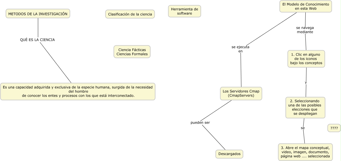 Este Cmap, tiene información relacionada con: Cmaptool_homepage_español, METODOS DE LA INVESTIGACIÓN QUÉ ES LA CIENCIA Es una capacidad adquirida y exclusiva de la especie humana, surgida de la necesidad del hombre de conocer los entes y procesos con los que está interconectado., El Modelo de Conocimiento en esta Web se ejecuta en Los Servidores Cmap (CmapServers), Los Servidores Cmap (CmapServers) pueden ser Descargados, 2. Seleccionando una de las posibles elecciones que se despliegan se 3. Abre el mapa conceptual, video, imagen, documento, página web .... seleccionada, 1. Clic en alguno de los iconos bajo los conceptos y 2. Seleccionando una de las posibles elecciones que se despliegan, El Modelo de Conocimiento en esta Web se navega mediante 1. Clic en alguno de los iconos bajo los conceptos