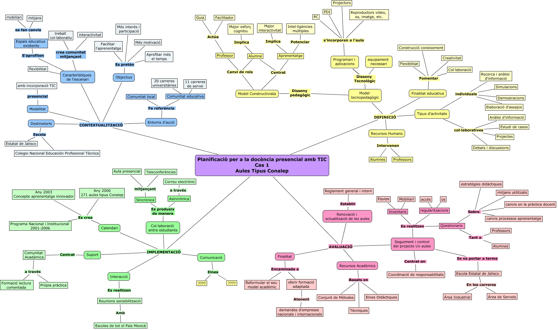 Este Cmap, tiene información relacionada con: CAS 1 AULES CONALEP_versió 3, Professor Actúa Guia, Qüestionaris Tant a Professors, Qüestionaris Tant a Alumnes, Planificació per a la docència presencial amb TIC Cas 1 Aules Tipus Conalep DEFINICIÓ Recursos Humans, Planificació per a la docència presencial amb TIC Cas 1 Aules Tipus Conalep AVALUACIÓ Recursos Acadèmics, Finalitat Encaminada a Reformular el seu model acadèmic, Model Constructivista Canvi de rols Professor, Model Constructivista Centrat Aprenentatge, Característiques de l'escenari crea comunitat mitjançant interactivitat, Objectius Es pretén Facilitar l'aprenentatge, Renovació i actualització de les aules Establir Reglament general i intern, Seguiment i control del projecte i/o aules Es va portar a terme Escola Estatal de Jalisco, Model Constructivista Canvi de rols Alumne, Espais educatius existents es fan canvis mitjans, Planificació per a la docència presencial amb TIC Cas 1 Aules Tipus Conalep DEFINICIÓ Finalitat educativa, Projectes col·laboratives Tipus d'activitats, Seguiment i control del projecte i/o aules Centrat en Coordinació de responsabilitats, Espais educatius existents es fan canvis mobiliari, Comunicació Eines ????, Recursos Humans Intervenen Alumnes