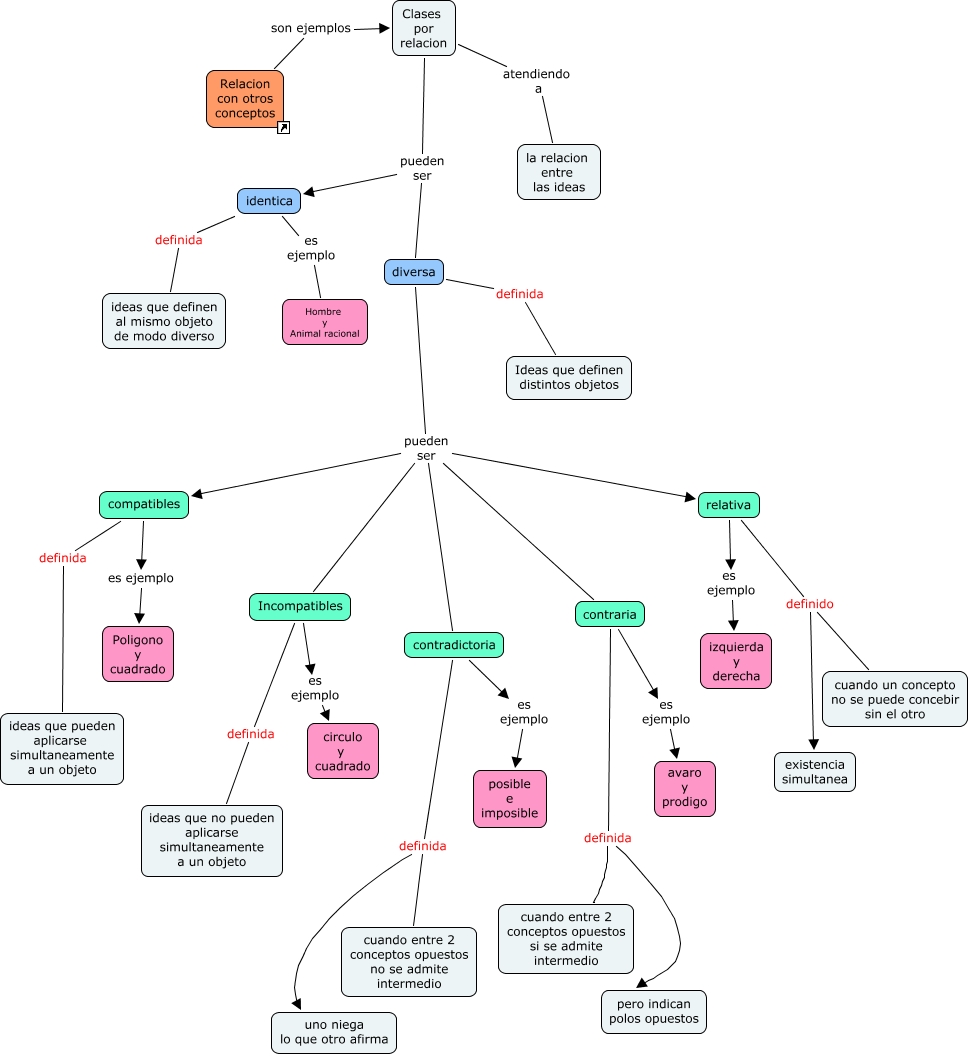 Este Cmap, tiene información relacionada con: Clases_por_relacion, identica es ejemplo Hombre y Animal racional, diversa pueden ser relativa, Incompatibles es ejemplo circulo y cuadrado, diversa definida Ideas que definen distintos objetos, diversa pueden ser contraria, contradictoria definida cuando entre 2 conceptos opuestos no se admite intermedio, diversa pueden ser compatibles, contradictoria definida uno niega lo que otro afirma, contraria es ejemplo avaro y prodigo, contraria definida pero indican polos opuestos, Relacion con otros conceptos son ejemplos Clases por relacion, diversa pueden ser Incompatibles, diversa pueden ser contradictoria, Clases por relacion pueden ser identica, compatibles definida ideas que pueden aplicarse simultaneamente a un objeto, Incompatibles definida ideas que no pueden aplicarse simultaneamente a un objeto, relativa es ejemplo izquierda y derecha, identica definida ideas que definen al mismo objeto de modo diverso, Clases por relacion atendiendo a la relacion entre las ideas, relativa definido existencia simultanea