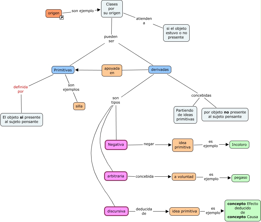 Este Cmap, tiene información relacionada con: Clases por Origen, Clases por su origen pueden ser derivadas, discursiva deducida de idea primitiva, Clases por su origen atienden a si el objeto estuvo o no presente, arbitraria concebida a voluntad, origen son ejemplo Clases por su origen, Negativa negar idea primitiva, derivadas concebidas Partiendo de ideas primitivas, Primitivas son ejemplos silla, derivadas son tipos Negativa, derivadas son tipos arbitraria, derivadas son tipos discursiva, Clases por su origen pueden ser Primitivas, a voluntad es ejemplo pegaso, Primitivas definida por El objeto si presente al sujeto pensante, derivadas concebidas por objeto no presente al sujeto pensante, derivadas Primitivas, idea primitiva es ejemplo Incoloro, idea primitiva es ejemplo concepto Efecto deducido de concepto Causa