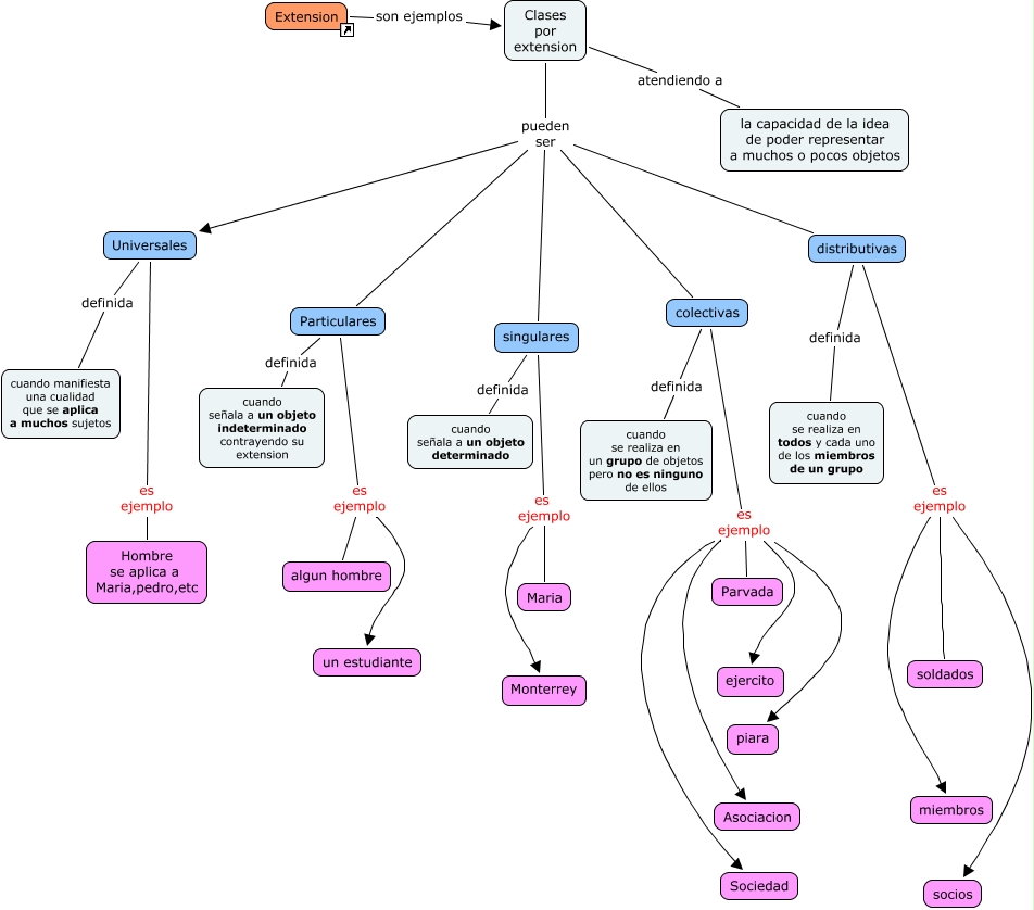 Este Cmap, tiene información relacionada con: Clases_por_extension, colectivas es ejemplo ejercito, Particulares es ejemplo un estudiante, distributivas es ejemplo socios, colectivas definida cuando se realiza en un grupo de objetos pero no es ninguno de ellos, Clases por extension pueden ser Universales, singulares es ejemplo Maria, colectivas es ejemplo Sociedad, colectivas es ejemplo Asociacion, distributivas es ejemplo miembros, Universales definida cuando manifiesta una cualidad que se aplica a muchos sujetos, colectivas es ejemplo piara, colectivas es ejemplo Parvada, distributivas es ejemplo soldados, Clases por extension pueden ser singulares, Clases por extension pueden ser Particulares, Universales es ejemplo Hombre se aplica a Maria,pedro,etc, Clases por extension atendiendo a la capacidad de la idea de poder representar a muchos o pocos objetos, distributivas definida cuando se realiza en todos y cada uno de los miembros de un grupo, Extension son ejemplos Clases por extension, Clases por extension pueden ser distributivas