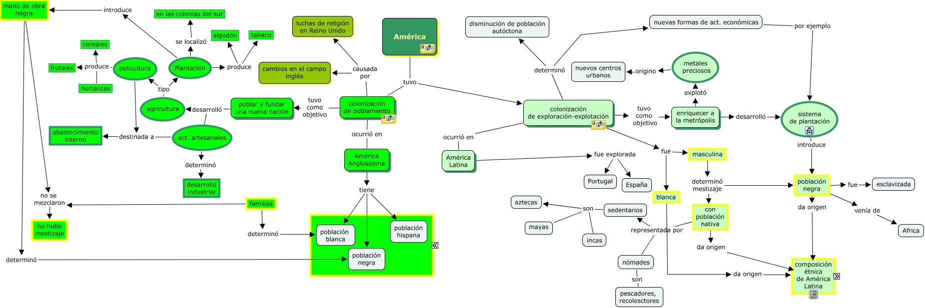 Este mapa conceptual tiene información relacionada a: 34 2009, colonización de exploración-explotación fue masculina, nómades son pescadores, recolesctores, poblar y fundar una nueva nación desarrolló agricultura, metales preciosos origino nuevos centros urbanos, América Latina fue explorada Portugal, blanca da origen composición étnica de América Latina, colonización de exploración-explotación fue blanca, América Latina fue explorada España, población negra da origen población mulata, familias no se mezclaron no hubo mestizaje