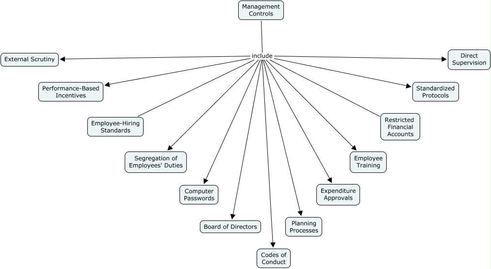 This Concept Map, created with IHMC CmapTools, has information related to: 20111059_Management Controls, Management Controls include Standardized Protocols, Management Controls include External Scrutiny, Management Controls include Segregation of Employees' Duties, Management Controls include Restricted Financial Accounts, Management Controls include Employee Training, Management Controls include Performance-Based Incentives, Management Controls include Employee-Hiring Standards, Management Controls include Board of Directors, Management Controls include Codes of Conduct, Management Controls include Computer Passwords, Management Controls include Direct Supervision, Management Controls include Planning Processes, Management Controls include Expenditure Approvals