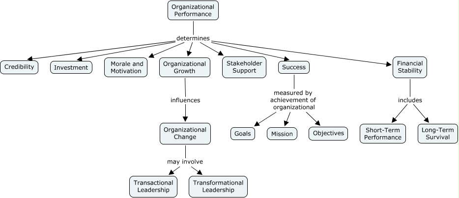 This Concept Map, created with IHMC CmapTools, has information related to: 20111059_Organizational Performance, Organizational Performance determines Success, Organizational Change may involve Transactional Leadership, Organizational Performance determines Stakeholder Support, Financial Stability includes Short-Term Performance, Success measured by achievement of organizational Objectives, Organizational Performance determines Financial Stability, Success measured by achievement of organizational Mission, Organizational Growth influences Organizational Change, Organizational Performance determines Credibility, Organizational Performance determines Organizational Growth, Organizational Performance determines Investment, Organizational Change may involve Transformational Leadership, Success measured by achievement of organizational Goals, Financial Stability includes Long-Term Survival, Organizational Performance determines Morale and Motivation