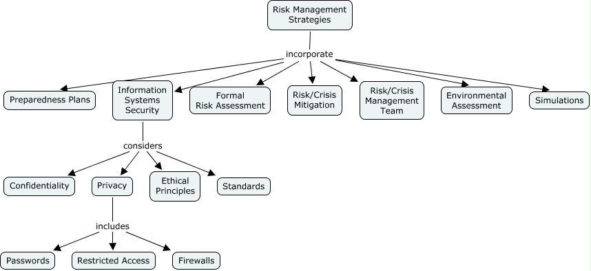 This Concept Map, created with IHMC CmapTools, has information related to: 20111059_Risk Management Strategies, Risk Management Strategies incorporate Risk/Crisis Mitigation, Privacy includes Passwords, Risk Management Strategies incorporate Simulations, Risk Management Strategies incorporate Risk/Crisis Management Team, Information Systems Security considers Standards, Privacy includes Restricted Access, Risk Management Strategies incorporate Preparedness Plans, Risk Management Strategies incorporate Environmental Assessment, Risk Management Strategies incorporate Information Systems Security, Information Systems Security considers Confidentiality, Privacy includes Firewalls, Information Systems Security considers Privacy, Risk Management Strategies incorporate Formal Risk Assessment, Information Systems Security considers Ethical Principles