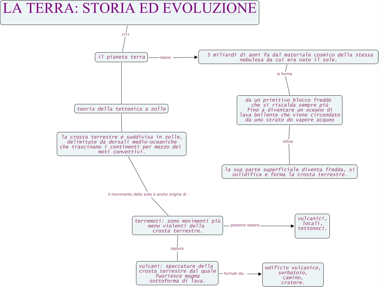 Questa Cmap, creata con IHMC CmapTools, contiene informazioni relative a: gladys,arianna,guardascione storia della terra, terremoti: sono movimenti più meno violenti della crosta terrestre. oppure vulcani: spaccature della crosta terrestre dal quale fuoriesce magma sottoforma di lava., il pianeta terra teoria della tettonica a zolle, 5 miliardi di anni fa dal materiale cosmico della stessa nebulosa da cui era nato il sole. si forma da un primitivo blocco freddo che si riscalda sempre più fino a diventare un oceano di lava bollente che viene circondato da uno strato do vapore acqueo, da un primitivo blocco freddo che si riscalda sempre più fino a diventare un oceano di lava bollente che viene circondato da uno strato do vapore acqueo infine la sua parte superficiale diventa fredda, si solidifica e forma la crosta terrestre., vulcani: spaccature della crosta terrestre dal quale fuoriesce magma sottoforma di lava. formati da: edificio vulcanico, serbatoio, camino, cratere., terremoti: sono movimenti più meno violenti della crosta terrestre. possono essere vulcanici, locali, tettonoci., la crosta terrestre è suddivisa in zolle, delimitate da dorsali medio-oceaniche che trascinano i continenti per mezzo dei moti convettivi. il movimento delle zolle è anche origine di : terremoti: sono movimenti più meno violenti della crosta terrestre., il pianeta terra nasce: 5 miliardi di anni fa dal materiale cosmico della stessa nebulosa da cui era nato il sole., LA TERRA: STORIA ED EVOLUZIONE ???? il pianeta terra, teoria della tettonica a zolle la crosta terrestre è suddivisa in zolle, delimitate da dorsali medio-oceaniche che trascinano i continenti per mezzo dei moti convettivi.